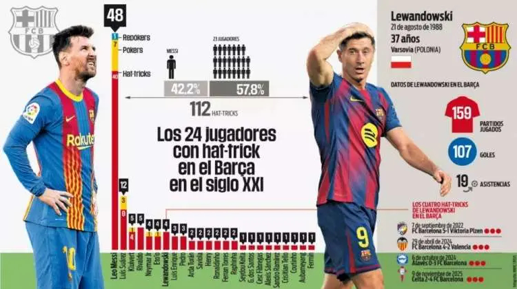 巴萨21世纪上演帽子戏法次数最多的球员,梅西断崖式领先!巴萨队史24位球员一共112次帽子戏法,梅西一个人占据42.2%,其余23人占据57.8%。1.梅西:48次2.苏亚雷斯:12次3.克鲁伊维特和里瓦尔多:各5次4.内马尔、埃托奥和莱万: 各4次5.路易斯·恩里克和佩德罗:各3次