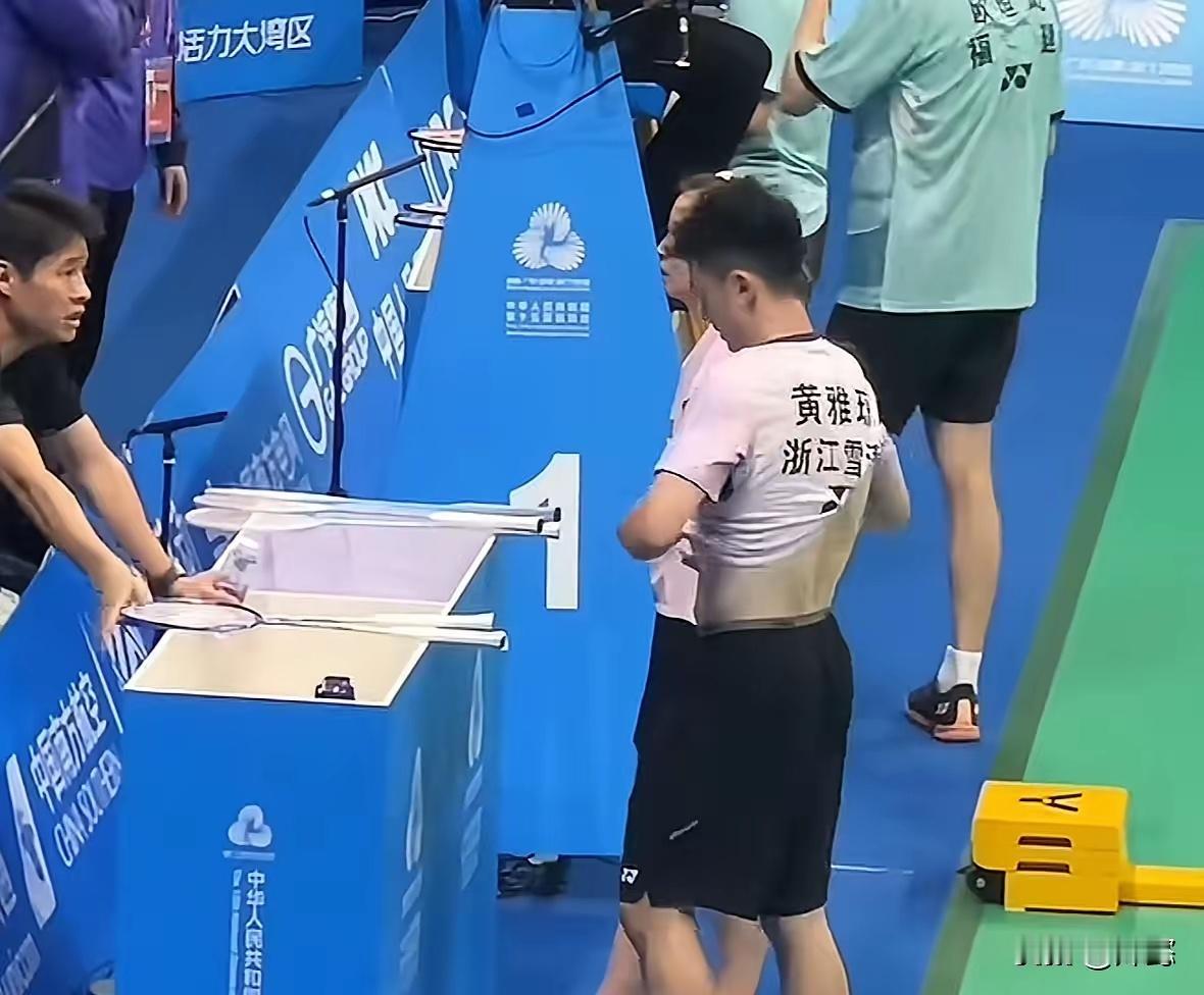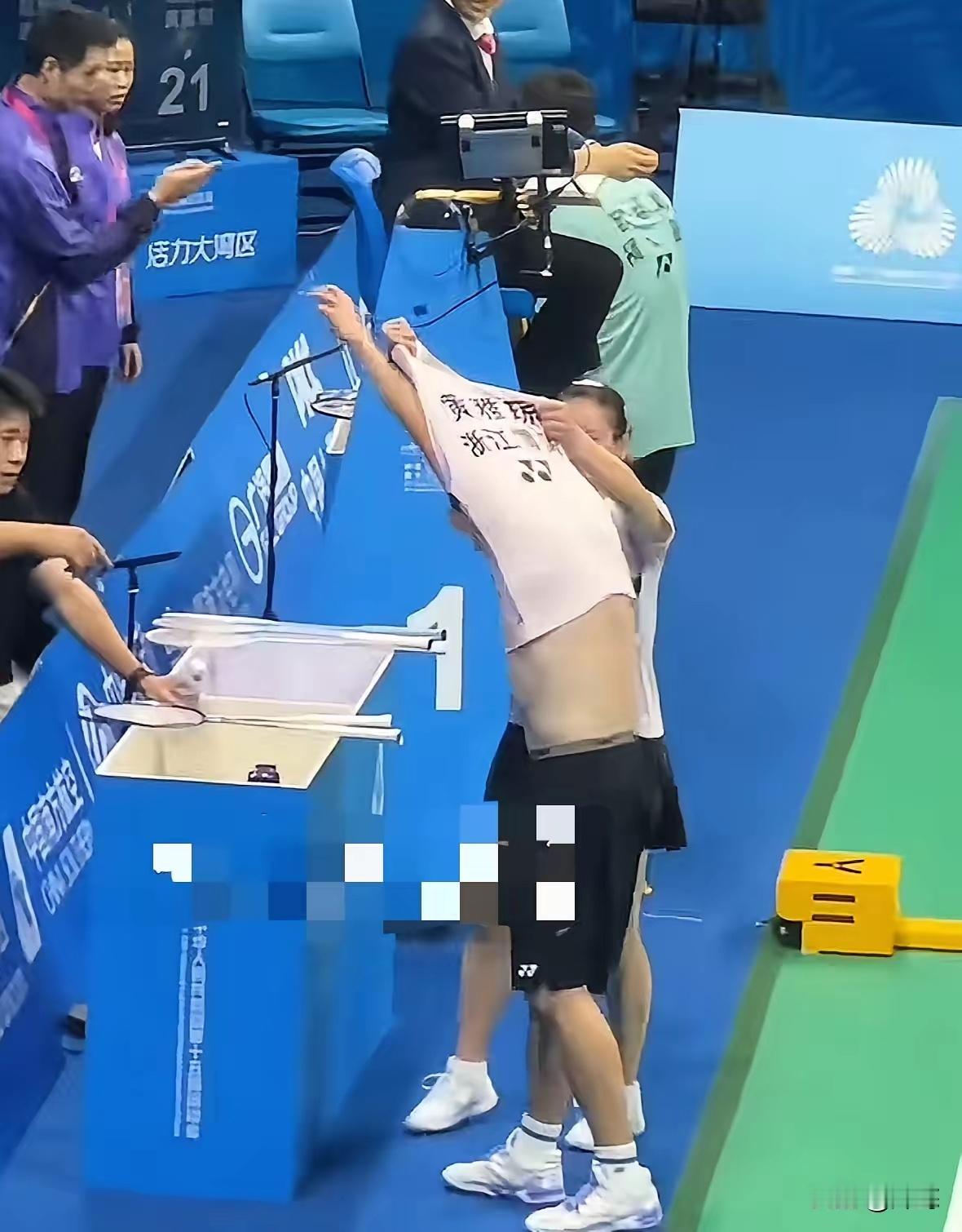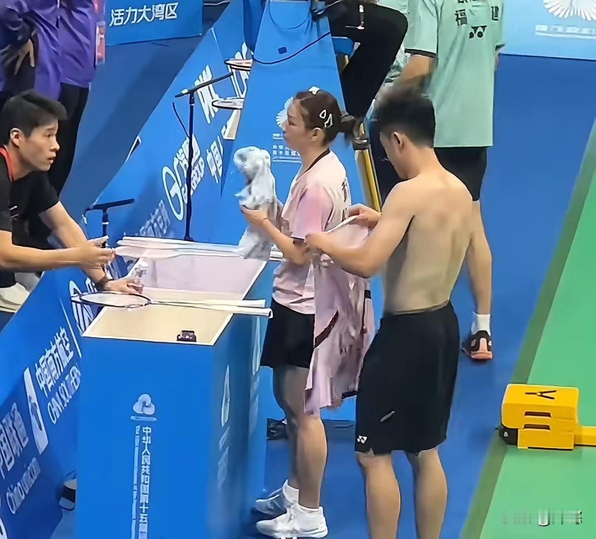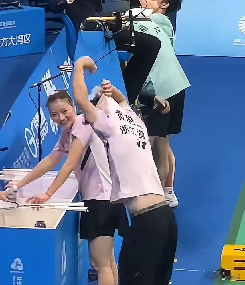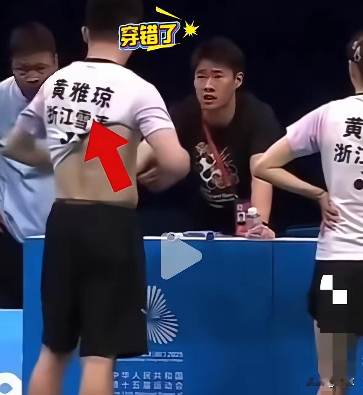 哈哈哈哈,笑不活了,一个人得闯多大的祸啊,郑思维刚刚在局间休息的时候,就这样当着现场观众的面换衣服,你说换就换吧,竟然穿成了雅琼的战服(图234),雅琼在一旁认真的听教练复盘,郑思维那件“紧身衣”怎么也拽不下来(图34),此时郑思维还没有发现穿错了,直到好不容易把衣服整理好,特别紧才发现穿错了,更尴尬的是怎么脱也脱不下来(图5),还得借助雅琼帮忙(图6),不仅现场观众笑,裁判都笑的老大声了,咱就是说郑思维眼看最后一舞了,洋相频出,前有拿塑料袋后有穿错衣服 ,这是退役前的福利吗?回归正题,恭喜雅思组合晋级混双四强。