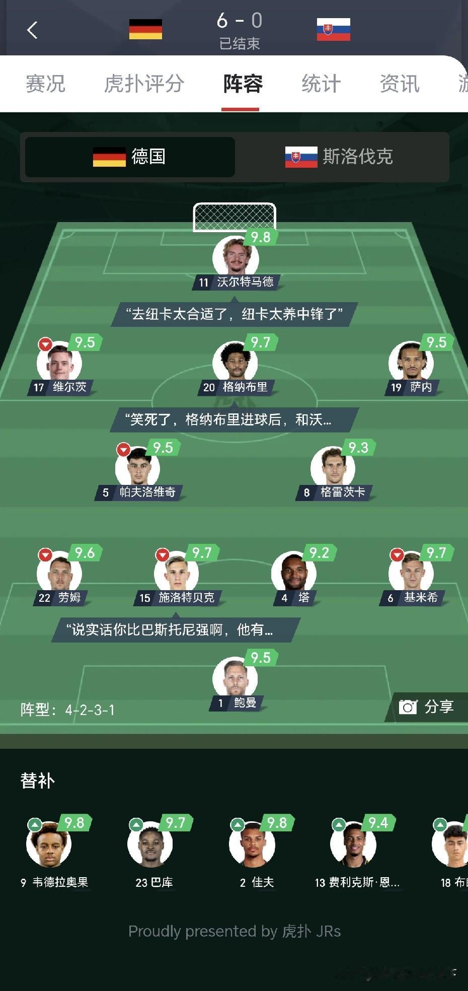 日耳曼战车终于解决了没有大中锋的问题了!苦无大中锋久矣,如今沃尔特玛德横空出世,既有身高又有脚下。明年世界杯德国队值得期待。 有一说一,认真起来的德国还是很可怕的,能看出来全队上下都憋着一口气要给首回合0:2输球报仇。更重要的是这场打出了德国队久违的气势和水平。 虽然明年世界杯德国不是夺冠大热门,但是进四强有可能的。一切皆有可能。 最后说一句,连萨内都能轻松吃饼,利物浦的前锋是有多菜啊?萨拉赫不那么独的话,维尔茨应该早就开张了。