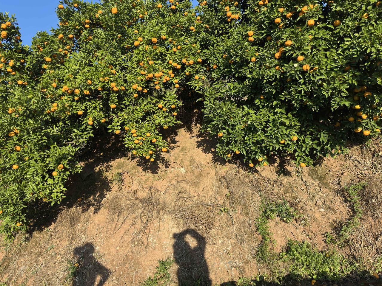 前几年去采摘桔子,都是桔园主人代摘的,这次去,一个一个的枯子都是自己用剪刀剪下来的,不知不觉就剪了这么一兜,用秤一称,五斤多了,付款15元钱。自己并不太爱吃枯子,打算拿回家后分享给亲朋好友。 采得桔子下山来,路过桔园主人的菜地,这青菜苗都长大了,不被用来移栽了,桔园主人让我们免费自摘青菜,我拔了三棵,清炒够一小盆了。 来到停车的地方,旁边种了好几棵马家柚,种柚人正在修剪,采摘了一大筐马家柚,我们问他马家柚怎么卖,他轻描淡写地说:“要就抱一个去!”意思是说免费赠送,我们每人抱了一个大大的马家柚上车,启程,回家,满载而归!