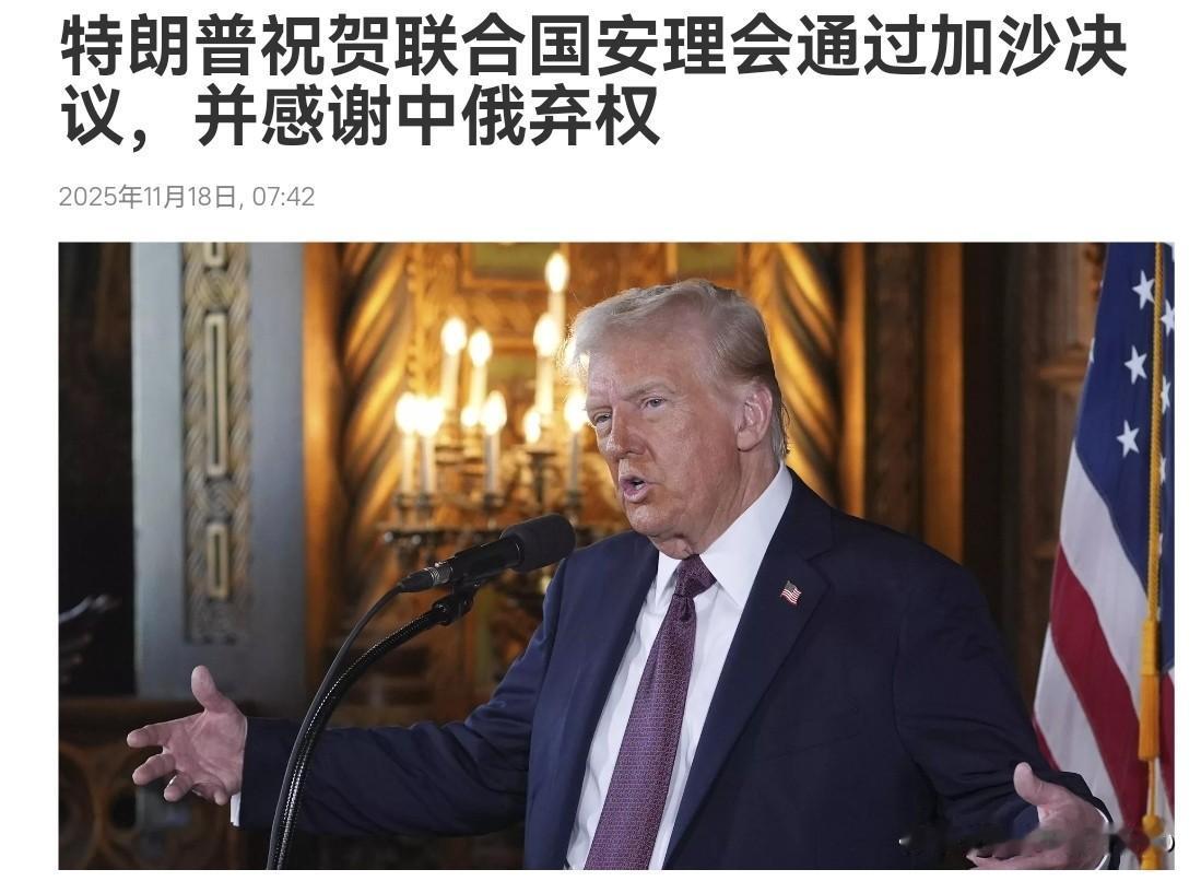 特朗普公开表态,感谢中国!高市早苗此时作何感想!11月18日,根据俄罗斯卫星通讯社报道,美国总统特朗普发文称,难以置信,联合国安理会就在几分钟前投票认可和批准了和平理事会,祝贺全世界。感谢联合国,感谢安理会所有成员国,感谢中国、俄罗斯、法国和英国。 为什么特朗普要对中俄两国表示感谢,因为特朗普很清楚,中国和俄罗斯都握有否决票,但中俄最终投出弃权票,让美国提议的在加沙组建临时管理机构(所谓和平理事会)和建立为期两年的国际维稳部队的提案获得通过,而这无疑也是中美两国罕见的在重要议题上达成共识。 考虑到中国没有反对美国,这事发生在中美APEC峰会之后,中国持续加码施压高市早苗之际,这无疑非常的微妙。中国投弃权票,这对于美国意味着什么呢?这意味着,中美两国合作确实可以做大事,干好事。很显然,中美贸易战休兵之后,这怕是第一次中美在国际重要问题上进行了合作。 不过,中美合作,特朗普感谢中国,这对于高市早苗意味着什么呢?恐怕高市早苗也不由得后背发凉。面对我们重压的高市早苗现在是巴不得美国出来说话,给日本撑腰。结果是美国国防部长不讲话,美国国务卿鲁比奥不讲话,特朗普本人也不讲话,特朗普还对中国喊话示好。很显然,美国传递出来的信息是高市早苗自己闯的祸,自己扛,美国并不反对中国对高市早苗的一顿收拾。