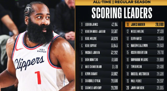 【哈登28000分里程碑】里程碑时刻!在快船vs76人的比赛中,哈登生涯总得分突破28000分大关,位列NBA历史得分榜第11位!