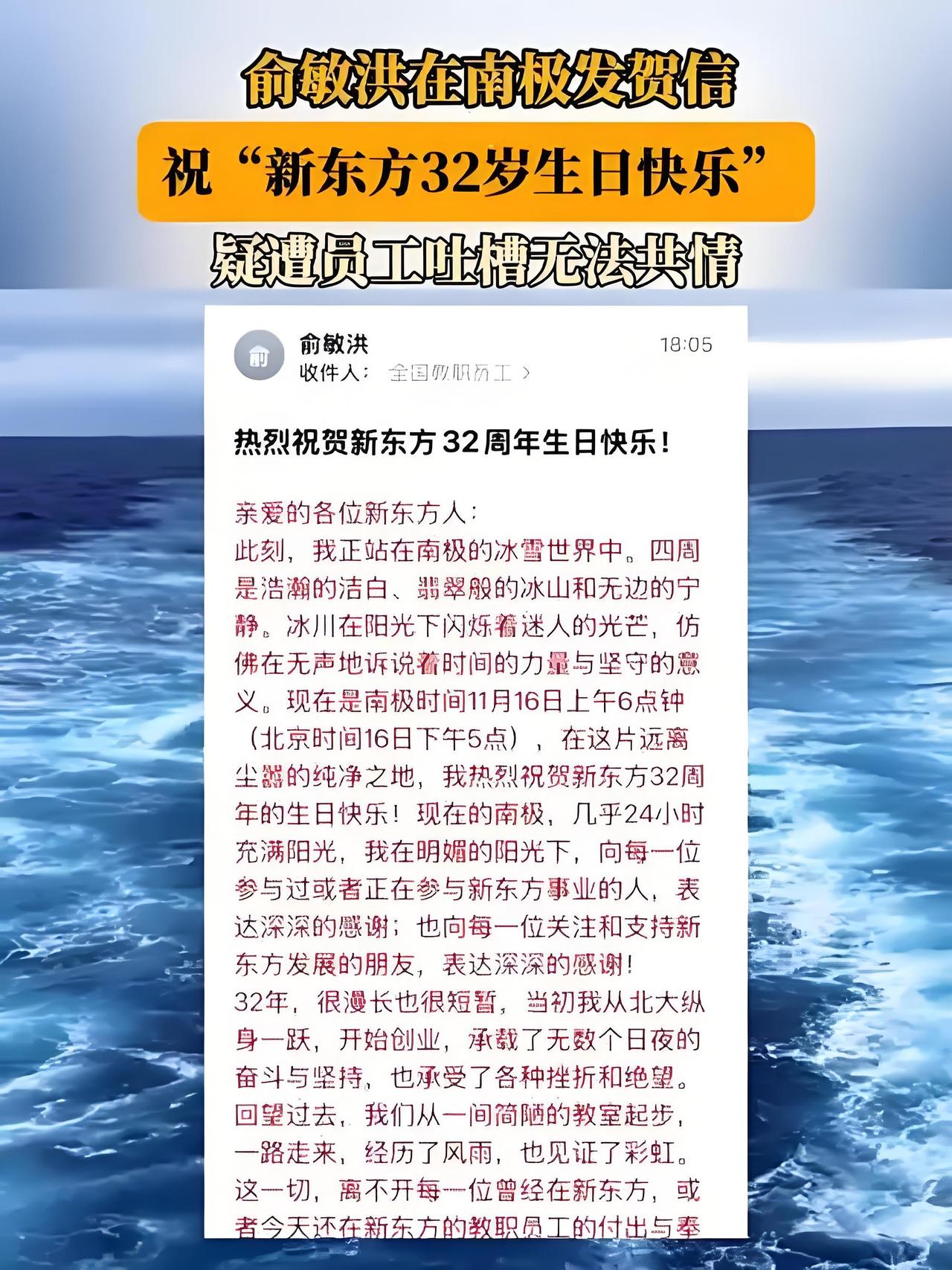 俞敏洪本想着上一波价值,结果适得其反。 老俞近来心情正好畅游南极“几乎24小时充满阳光”并希望员工懂得“时间的力量与坚守的意义”。全文都是我怎样怎样,南极如何美丽,纯净啥的。最后来句不咸不淡的对员工表示感谢! 俞敏洪心中暗爽这波价值观上的太是时候了。没想到员工并不买帐,我们在拼命干班干,你倒好“24小时充满阳光”现在的员工可不是七零八零后那波人好糊弄了,人家不爽都是直接表达出来,感觉俞敏洪自以董宇辉事件后干啥都是错呢?
