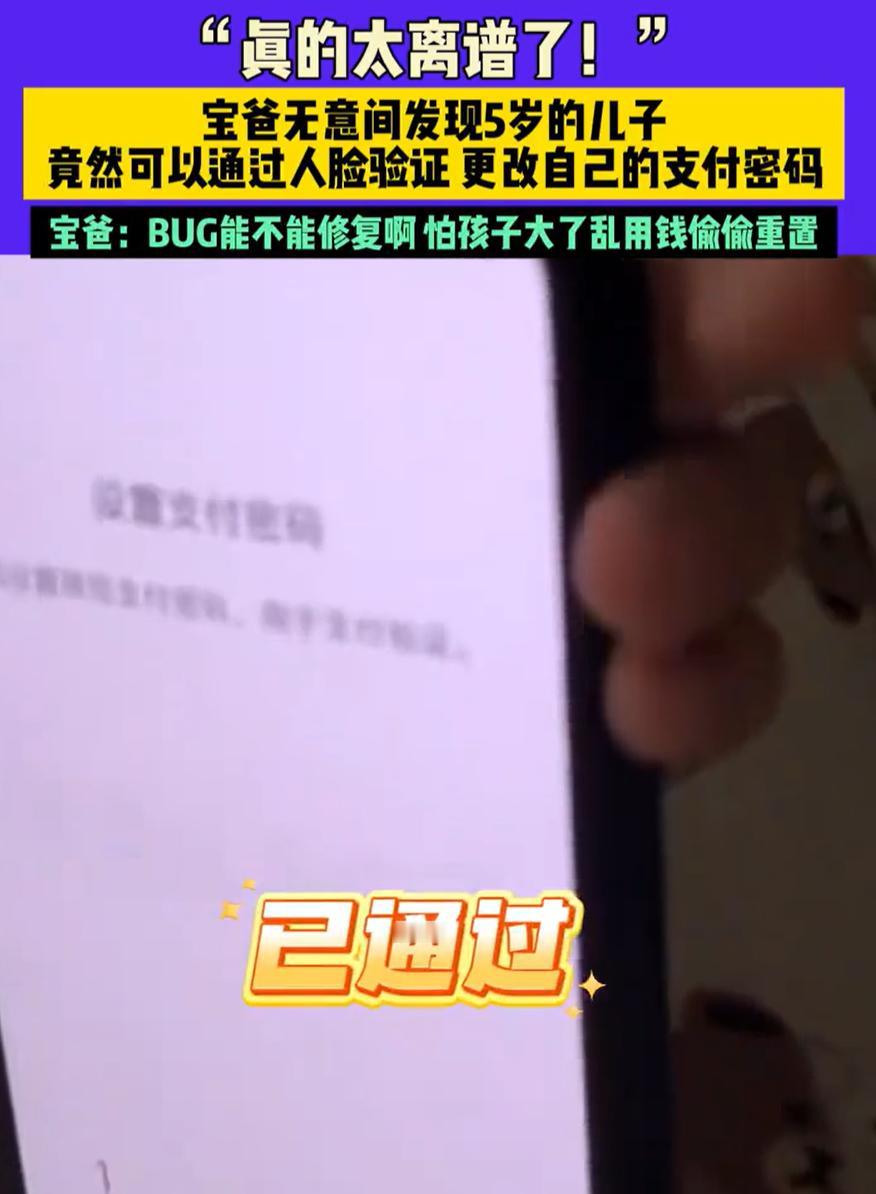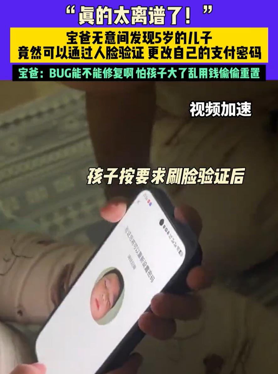 “这一看就是亲生的!”广东,一位宝爸把自己的手机给5岁的儿子看动画片,无意间却发现,儿子竟然能通过人脸识别更改他的支付密码,说出来妻子还不相信,于是他让儿子亲自演示了一番。网友:看把他心里美的,这明显是在炫耀 视频中,宝爸给妈妈转账100块钱,到了支付环节,就把手机给儿子操作,儿子自然是不知道支付密码的,输了一串数字后显示密码错误,紧接着,他就点击更改密码,系统显示需要人脸识别,孩子就用自己的脸刷了一下,很快显示验证成功,这下妈妈彻底相信了 对此,有网友表示:告诉你一个好消息,跟一个坏消息,坏消息就是你的密码不安全,好消息就是你的儿子是亲生的 这事听起来有点神奇,细想却在情理之中。如今不少家庭相册里,孩子的照片比大人的还多。手机厂商的人脸识别系统在大量数据训练下,对亲子间的面容相似度已经有了相当高的识别能力 孩子的脸部特征虽然还在成长,但骨骼结构、眉眼间距这些关键信息,往往与父母高度相似 当然,这事也给不少家长提了个醒,手机的权限要重新审视,家长既可以放心让孩子玩,也可以稍微提前做一些小隔离,比如单独的儿童模式、关闭支付快捷验证,别把支付、健康、公司账户这些都混在一起,不然小朋友一个好奇就把关键操作给点了