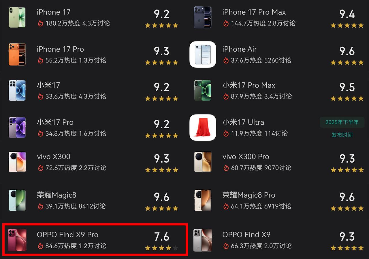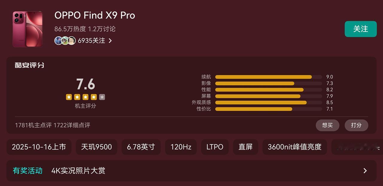 9-10月多款旗舰机的酷安用户评分,OPPO Find X9 Pro的得分垫底,平均分才7.6分,远低于其他机型的分数。 OPPO Find X9 Pro在发布会上号称是“相机”,“超越Ultra的2亿长焦”,然而酷安用户给这款手机的影像评分平均分只有7.3分,在六项参考维度中排名倒数第二,倒数第一的是性价比,第一则是续航。 大家认为这几款旗舰机中哪款的影像更强?