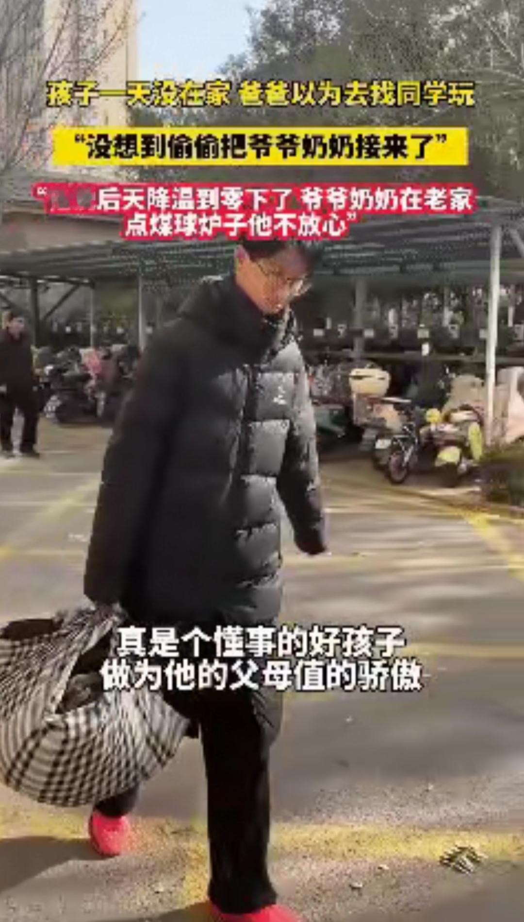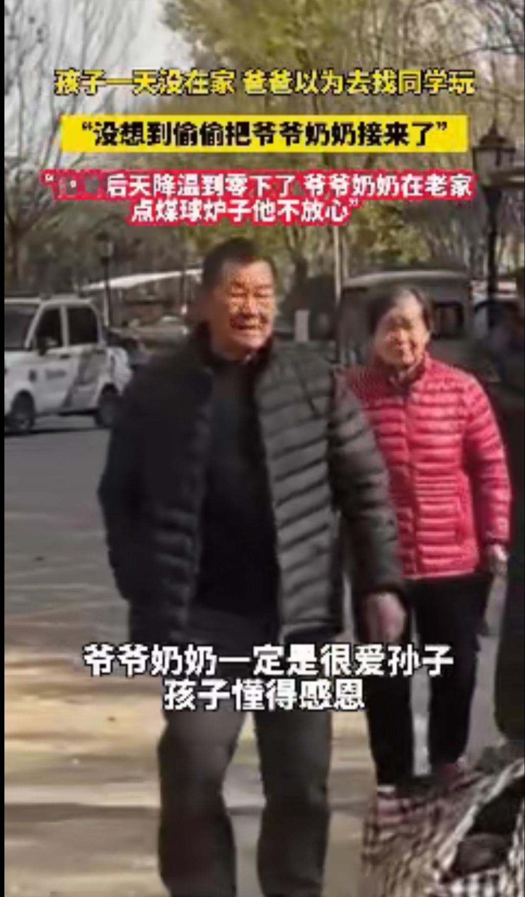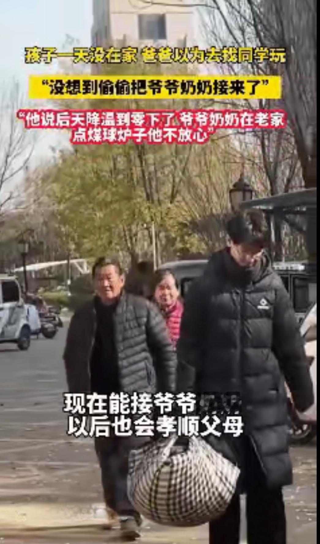 太暖心了!近日山东,爸爸发现儿子一整天都不在家,以为儿子是找同学玩了就没放心上,到了下午才知道,瞒着爸妈独自跑回老家,硬把爷爷奶奶接来城里过冬,这才是隔代亲最动人的模样! 11月的山东已浸着透骨的凉,李先生在厨房掀了三次锅盖,西红柿炒蛋的香味飘满客厅,可儿子小宇还没回家。 他掏出手机划了划,没看到儿子的消息,转念一想,周末孩子跟同学去图书馆或者打球都正常,便擦了擦手坐在沙发上等,电视里的节目没看进去多少,时不时抬头瞥一眼门口。 下午三点,防盗门“吱呀”一声被推开,李先生抬头的瞬间,手里的遥控器差点滑落在地。 门口站着的不是满身大汗的儿子,而是裹着厚棉袄、鼻尖冻得通红的父母,小宇就跟在二老身后,小手冻得发紫却死死攥着一个鼓鼓的行李袋,脸上挂着疲惫却藏不住的笑意。 爸,妈?你们咋来了?李先生快步上前,谁也没料到,这个12岁男孩消失的大半天里,藏着一场跨越几十公里的暖心奔赴。 小宇后来跟爸爸说,上周视频时,他看见爷爷总往炭火盆边凑,双手缩在袖子里,奶奶说“屋里不冷”的时候,哈气都凝成了白霜。 挂了视频,小宇摸了摸家里暖烘烘的暖气片,心里像被什么揪了一下,爷爷奶奶在老家烧煤球取暖,去年冬天爷爷还因为呛着住过院。 他没跟爸妈说,怕他们嫌麻烦,更怕爷爷奶奶不肯来,于是次日一早,他揣着零钱出门,临走前偷偷把爷爷奶奶的老花镜、降压药,还有奶奶最爱的碎花小毯子塞进书包。 两趟公交辗转两个多小时,小宇终于到了老家村口,他一路小跑冲进院子,正蹲在灶台前添煤的爷爷抬头看见他,手里的煤铲“当啷”掉在地上。 爷爷奶奶,跟我去城里过冬!小宇拉着老人的手往屋里拽,可爷爷奶奶却犯了难,家里的鸡没人喂,菜园的菜也该收了,去城里还给你们添麻烦。 小宇没急着反驳,转身给邻居张大爷打了电话,拜托他帮忙照看鸡和菜园,又把自己攒的零钱塞给爷爷。 张大爷说每天帮咱们喂鸡,菜收了放他家冰箱,城里有暖气,再也不用烤炭火了,你们不走我就留下陪你们! 看着孙子较真的模样,老人终究没拗过,匆匆收拾了几件换洗衣物就跟着他出了门。 返程时,小宇拎着最重的行李走在前面,过路口时特意站在车流来的方向,把爷爷奶奶护在身后,就像小时候老人牵着他过马路那样。 李先生这才想起,父母在乡下住了一辈子,五年前他在城里买房后,多少次劝老人搬来同住,都被“住不惯”“怕添麻烦”婉拒。 小宇三岁到七岁都是爷爷奶奶带大的,这些细碎的温暖,都悄悄刻进了孩子心里。 就像小宇一样,他们都在用最朴素的方式,回应着长辈的疼爱。 我们总说工作忙、应酬多,把陪老人的事推到“以后”,可小宇用行动告诉我们,想念从来等不起。 小宇或许不懂“孝善传承”这样的大道理,却用一场跨越几十公里的奔赴,诠释了最本真的孝心。 这个冬天,城里的暖气很足,但比暖气更暖的,是孩子把想念变成行动的那份坚定。 而这份坚定,恰恰是我们每个人都该守住的初心,爱从来不是挂在嘴边的承诺,而是把“我想你”变成“我来了”的实际行动。