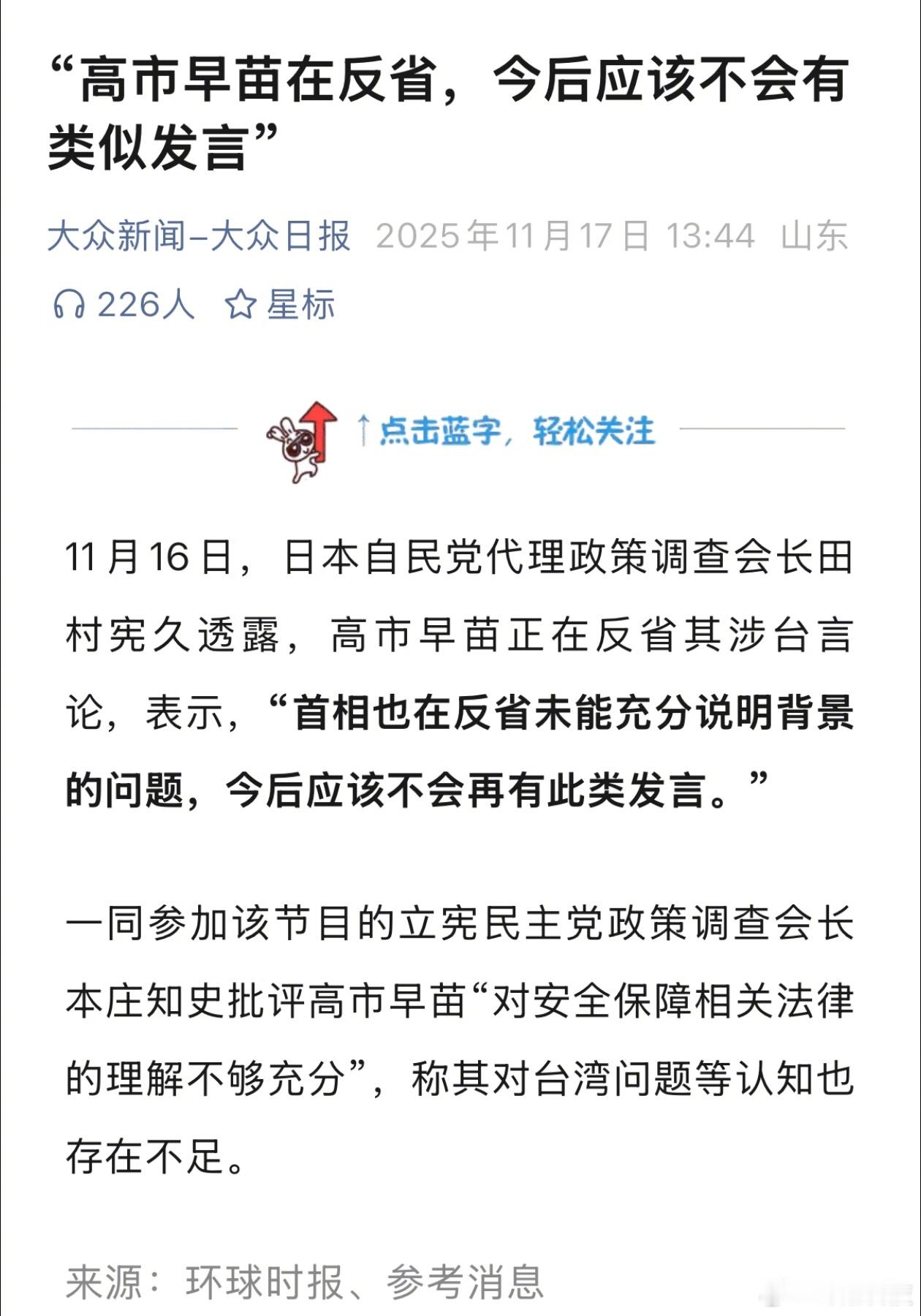 “高市早苗在反省,今后应该不会有类似发言”