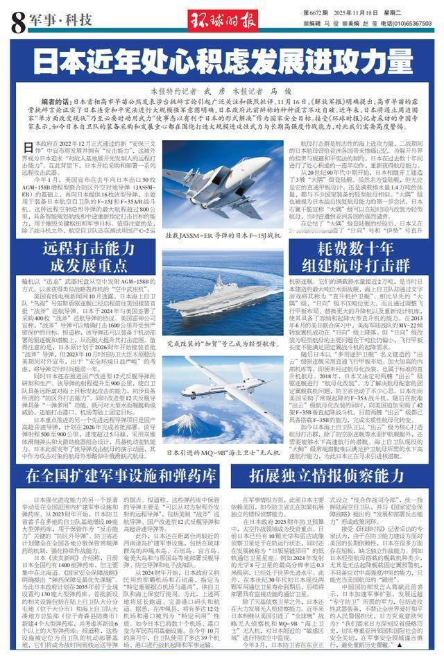 日本谋求“先发制人打击能力”,我们必须高度警惕!11月18日,《球球时报》发表特约记者文章《日本近年处心积虑发展进攻力量》,从“重点发展远程打击能力”、“组建航母打击群”、“在全国扩建军事设施和弹药库”、“拓展独立情报侦察能力”等四个方面予以阐述;而其中揭示的日本武器装备,更是触目惊心!想想看,日本地处东亚,是一个岛屿国家,因为地震、火山、海啸、台风等自然灾害已经导致其民族危机感十分强烈,所以谋求新的领土就成为必然。而现在,日本国内对领土方向有着两个截然不同的讨论,其一就是前往西伯利亚,虽天寒地冻但幅员辽阔,关键是现在仍人烟稀少,但关东军战俘的惨痛经历让他们有些“望而却步”;其二就是中华大陆,真正的地大物博,但关键是现在人口众多又国家强盛,所以也有些“望而生畏”。但是,站在咱们的角度来看,自1308年倭寇犯边以来,至今700余年,对咱们造成的伤害可以说是罄竹难书,而这个史实更是证明,它们其实可能更觊觎的就是中华大地!
