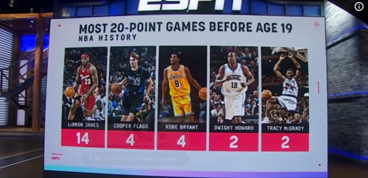 19岁以前单场得分20+次数,詹姆斯14次断档第一,科比和弗拉格并列第二。