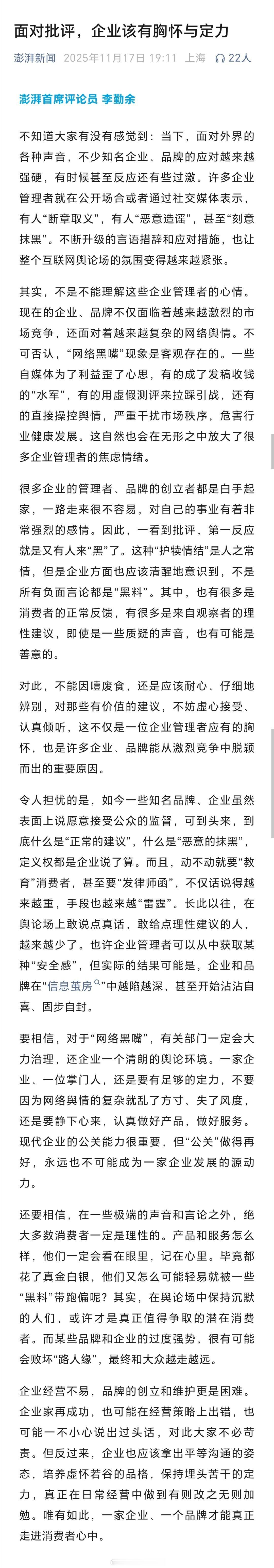 澎湃新闻:面对批评,企业该有胸怀与定力