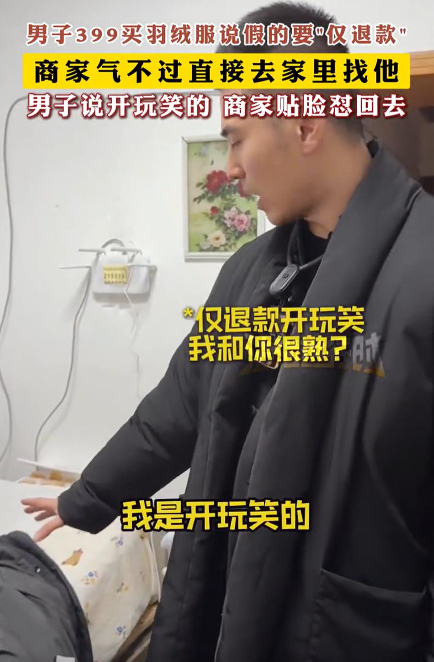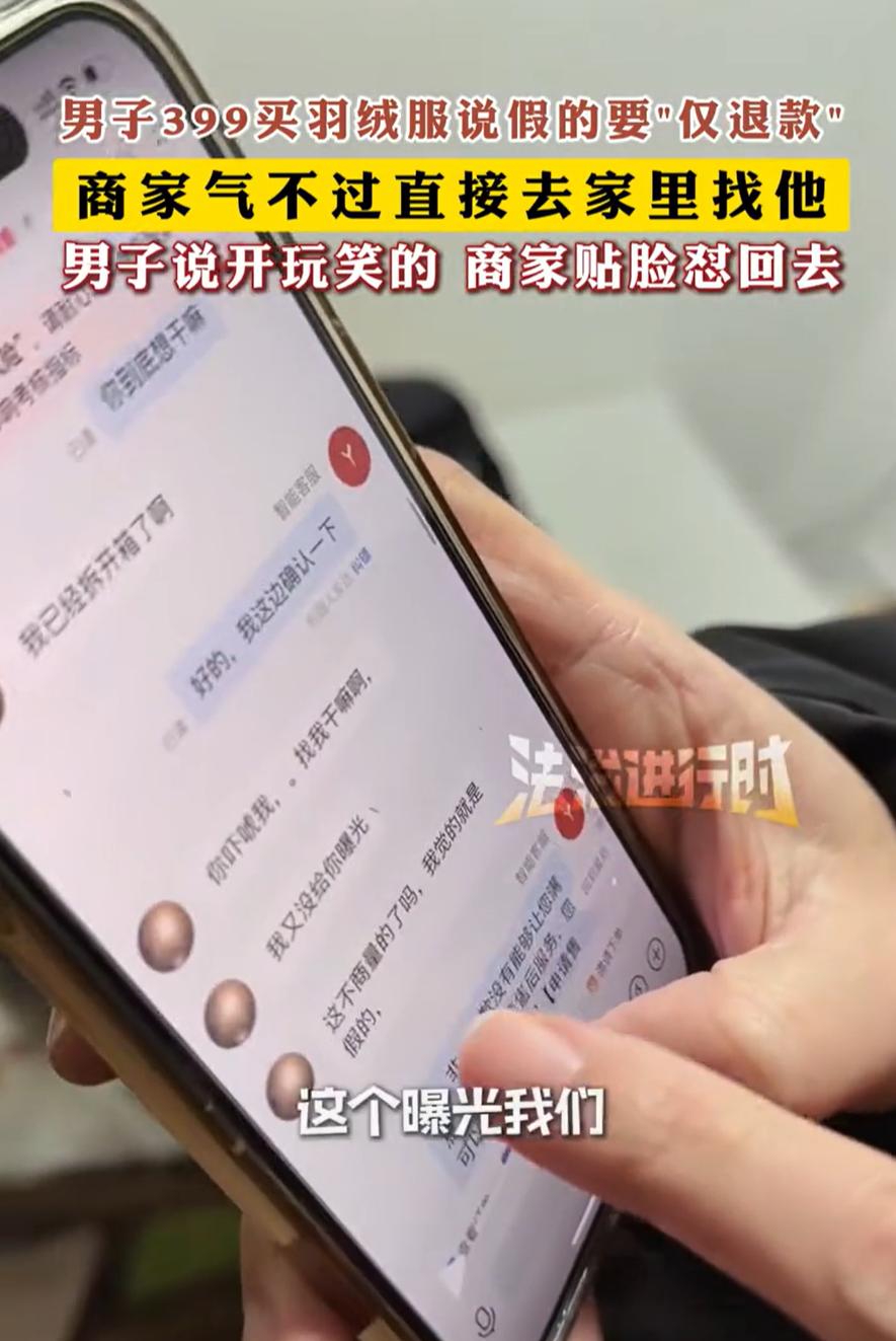 “遇到狠人了!”北京,一男子花399元买了一件羽绒服,可收到货后,不仅打差评说里面没有绒,还要求商家仅退款,商家一气之下顺着收货地址找到了男子,一看商家动了真格的,男子当场改口:我那是开玩笑的! 据老板介绍,男子仅退款的操作还不是让他最生气的,而是他一边以“没有绒”为由进行仅退款,一边在商家的群里面说商品不行,说老板人不行,甚至还想要老板给他赔钱,所以他必须找到这个人,当面讨个说法 这一找,就出现了戏剧性的一幕。原本在网上言辞强硬的男子,见到商家真人出现在面前,态度立刻软了下来。他改口说,自己之前的那些差评和退款要求都是开玩笑的,不是认真的 商家也是有备而来。他当场拿出手机录像,用小刀划开那件羽绒服,从里面掏出填充物给男子看,证明里面确实是有绒的。即便证据摆在眼前,男子也没有真正道歉,只是反复强调自己是开玩笑,还要求商家删除录像视频。这个要求被商家直接拒绝了 有网友说:要是不喜欢可以退货退款,仅退款是咋回事,退货退款运费都商家出 这话说的没错,对消费者来说,维权是权利,但权利不能滥用。如果真的对商品不满意,退货退款是正当途径;如果觉得是假货,更需要有理有据地提出。仅退款不退货,除非商家明确同意,否则本质上是不当得利 而且严格来说,男子在商家的粉丝群里公开质疑商品,本质上已经不是私下抱怨了,而是一种面向群体的评价行为。既然是公开说法,就必须承担相应的责任。尤其是当你用的是确定语气,说衣服不行,说老板不行,还把问题往质量上靠,这种话不是情绪宣泄,而是事实指控。事实指控就必须有事实支撑 如果商家真要追究,那男子可能就不仅仅是退货退款的问题了