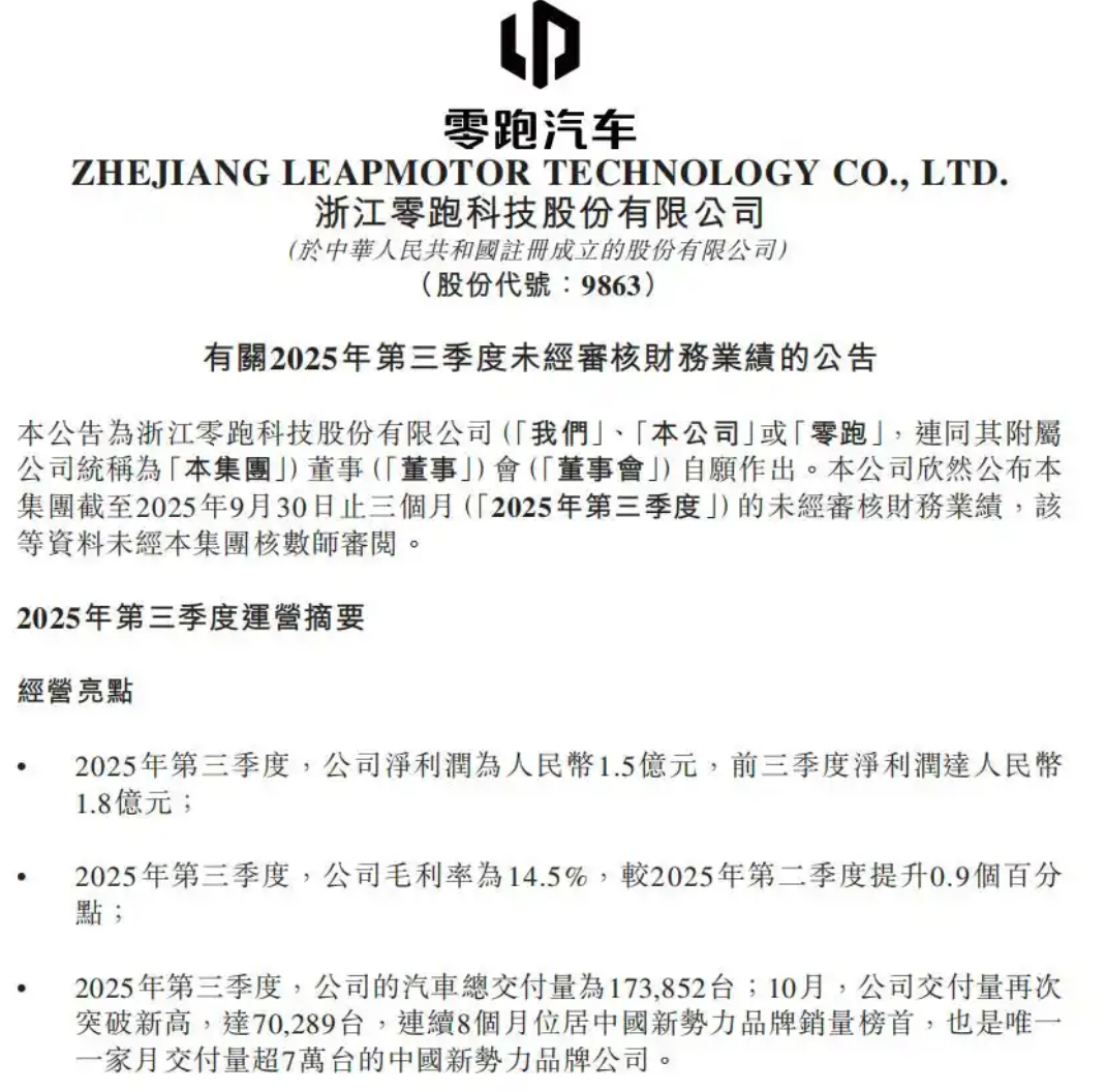 零跑汽车发布2025年三季度财报,今年三季度净利润1.5亿元。