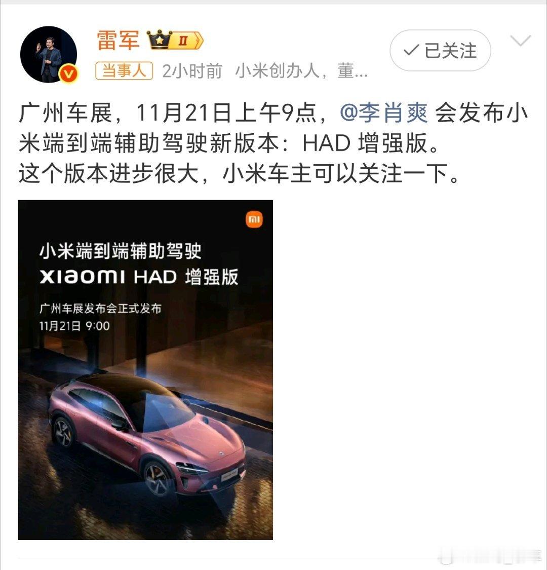 小米车主看过来~雷军预告广州车展大动作:11月21日上午9点, 带HAD增强版辅助驾驶亮相,新版本进步显著。