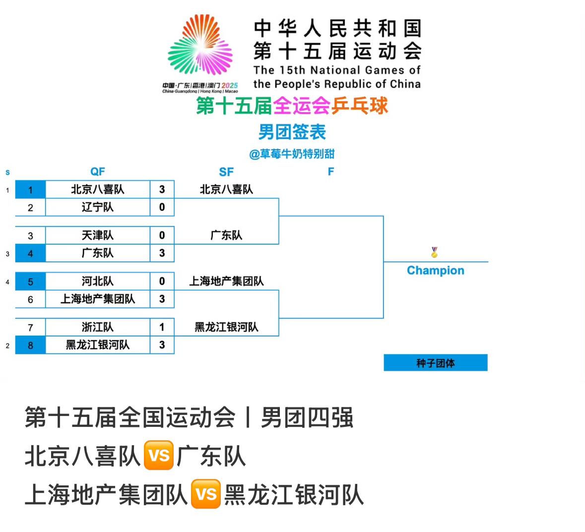 15全运会乒乓球男团4强出炉 北京队VS广东队 上海VS黑龙江 今晚6:00男团半决赛, 最后胜出的应该 还是北京与上海男团! 王楚钦与樊振东应该还有一场 强强对抗, 到时候就看教练组的安排啦, 团体赛,我觉得王楚钦如果 对上樊振东,赢球的几率很大, 樊振东加油, 王楚钦加油!