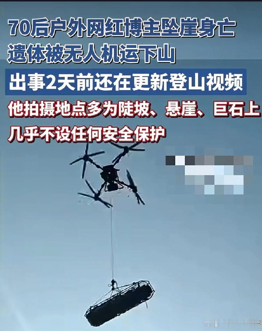 11月16日,青岛崂山一名户外网红博主因徒手攀岩坠崖身亡,遗体被无人机吊运下山,引发广泛关注。 11月16日,青岛崂山发生一起悲剧,一名70后户外网红博主在徒手攀岩过程中坠崖身亡,遗体被无人机吊运下山。该博主是当地知名户外探险者,拥有4670名粉丝,每周组织超过2000人的登山活动。据知情人士透露,这位博主热衷于挑战险峻的山路,拍摄地点多为陡坡、悬崖和巨石,几乎不设置任何安全保护措施。11月14日,他还在视频中展示徒手攀爬巨石的画面,下方即是直坠的悬崖,令人震惊。此次事故不仅反映了户外探险的危险性,也引发了对户外活动组织者安全责任的关注。当地救援队工作人员表示,只有确认遇难者无生命迹象时,才会使用无人机进行遗体运输,以减少二次伤害风险。此事件再次提醒公众,在追求刺激的同时,必须重视安全防护,敬畏自然。登山坠崖 爬山坠崖