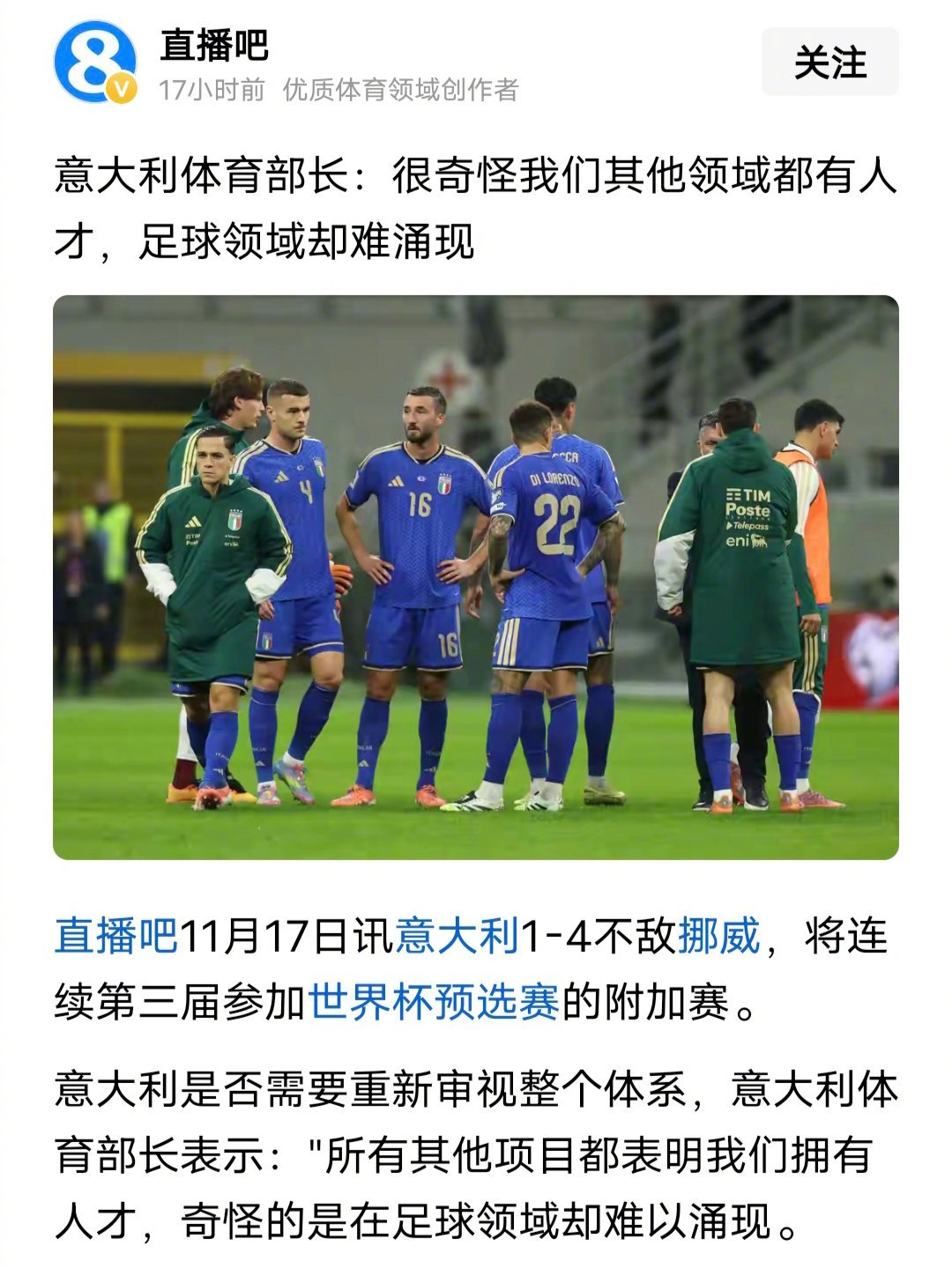 意大利也遇到了和中国一样的难题,意大利体育部长表示,所有其他项目都表明我们拥有人才,奇怪的是在足球领域却难以涌现意大利足球是不是被中国主持人那一嗓子吓掉魂了?要不找个人给意大利足球叫叫魂???
