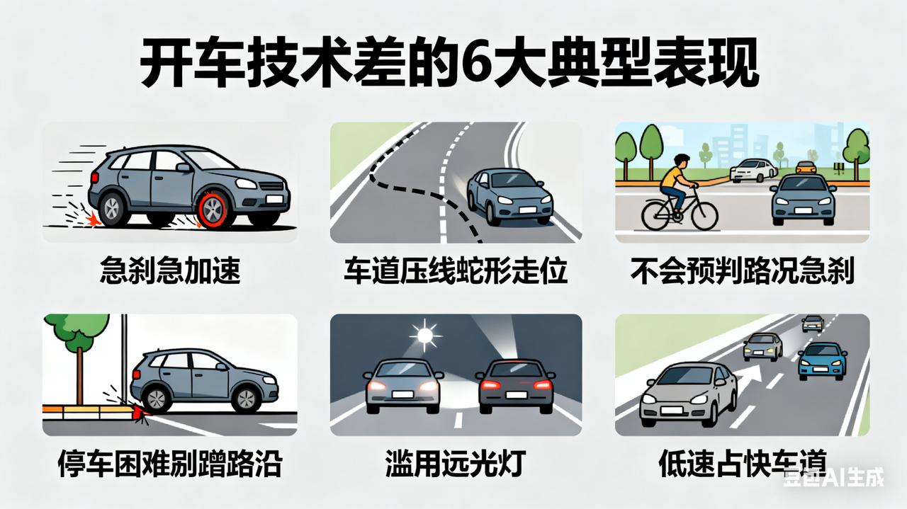 开车菜不菜,看这6个细节就够了!老司机都认同。 1. 频繁急刹急加速:起步猛踩油门窜出去,遇情况猛踩刹车,车身频繁顿挫。 2. 车道把控差:行车时频繁压线、蛇形走位,或与旁车距离过近,需频繁调整方向。 3. 不会预判路况:对前车减速、路口车流等无预判,常临时变道、急刹,影响后车通行。 4. 停车困难:侧方、倒车入库需多次调整,甚至剐蹭路沿、邻车,耗时远超正常水平。 5. 滥用灯光:白天开远光灯、夜间会车不切换近光,或雾天、隧道内不开启对应灯光。 6. 低速占快车道:长期在高速/城市快速路快车道以低于限速行驶,且不主动避让后车。