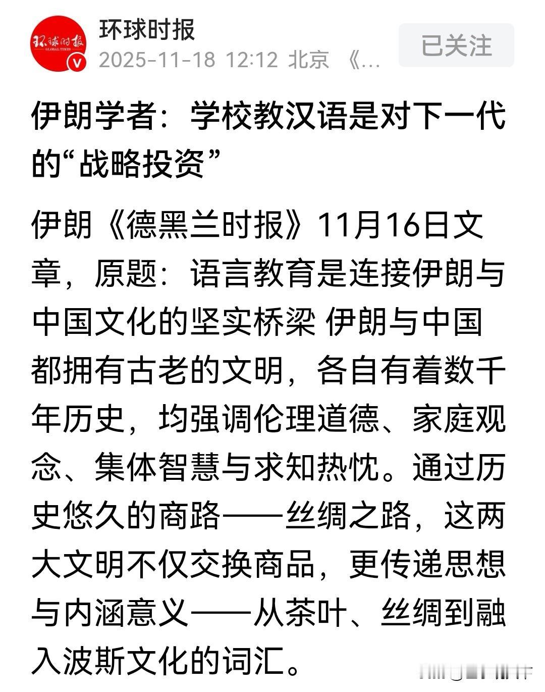 伊朗学者这话太实在了! 现在伊朗学校教汉语,哪儿是简单学门外语啊,简直是给下一代的“战略投资”! 中国现在经济、文化影响力越来越大,中伊合作也越来越深,学会汉语,不管是做贸易、搞交流都占优势。而且汉语里藏着独特的思维方式,学了还能开阔国际视野,未来在全球舞台上说话都更有底气。 这波布局,真是看得又远又准!