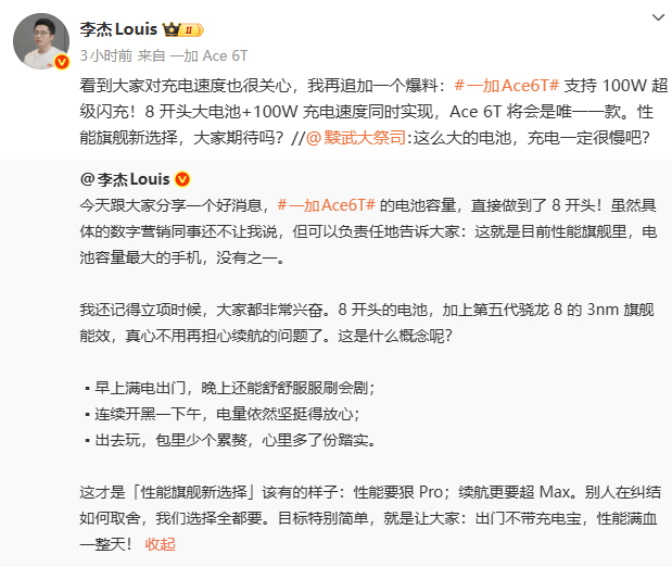 一加Ace6T爆料,电池容量直接做到了8开头,还有100W快充