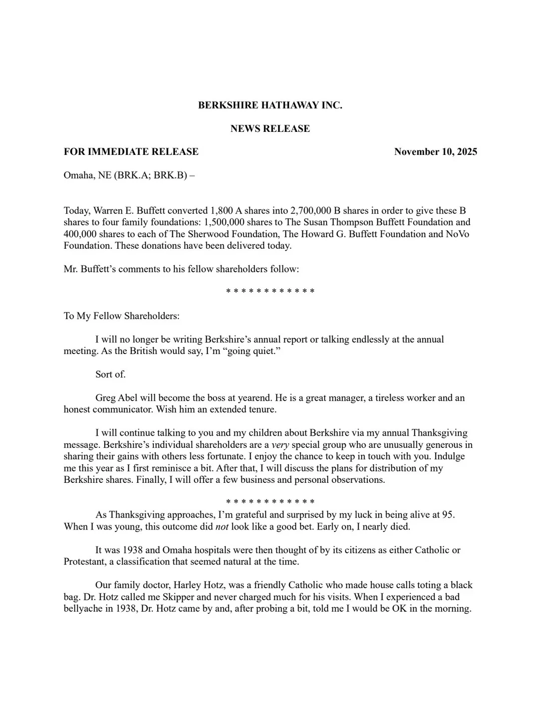 另外建议阅读巴菲特今年11月的致股东信。他表示将在伯克希尔年报及股东大会上”going quiet”。道别信中的人生哲学非常有意思。请期待笔记。