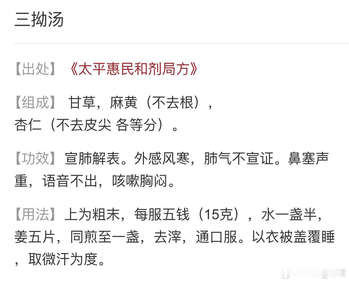 与桂枝汤齐辉?揭秘仲景另一首方剂之王:三拗汤“三拗汤”是一首在中医方剂史上地位非凡,却又时常被普通爱好者所忽视的经典名方。与“群方之冠”桂枝汤相比较,有人甚至认为其价值不输桂枝汤。那么,今天我们就来为三拗汤“正名”,看看它究竟凭什么能被称为张仲景笔下的另一首“方剂之王”。在开始之前,我们需要明确一个核心观点:将三拗汤与桂枝汤相比较,并非要分出孰优孰劣,而是为了理解它们在不同战略层面的巨大价值。如果说桂枝汤是一位善于调和阴阳、治理国家的“宰相”,那么三拗汤就是一位专攻肺系关隘、能征善战的“大将军”。二者各司其职,同等重要。第一:名方出身与核心病机1.名字里的“拗”脾气三拗汤,出自东汉张仲景的《伤寒论》,但其具体的成型与命名,实为后世医家对仲景学术思想的提炼。它本质上是麻黄汤(麻黄、桂枝、杏仁、甘草)去掉了桂枝而成。那么,为何叫“三拗汤”呢?这个“拗”字,非常传神地体现了它的个性。一拗:麻黄不去节。麻黄通常去节使用,以求发汗之力峻猛。但在这里,不去节是为了让发汗之力稍显缓和,更专注于宣通肺气。二拗:杏仁不去皮尖。杏仁皮尖味涩,传统认为去皮尖后降气止咳效果更纯。但这里保留皮尖,是取其“轻扬”之性,与麻黄配伍,一宣一降,更为协调。三拗:甘草不炙而生用。炙甘草偏于补中益气,而生甘草则长于清热解毒,并能调和诸药,在此方中更侧重于佐制麻黄的温燥之性。所以,“三拗”实则体现了古人在用药上的深思熟虑:并非追求最猛烈的药效,而是追求最精准的力道,直指病机核心。2.核心病机:风寒束肺三拗汤所治的核心,非常简单直接:风寒外邪,束缚住了肺的宣发肃降功能。我们可以用一个简单的比喻来理解:我们的肺像一个风箱,一呼一吸,维持着气息的出入。当风寒邪气来袭,这个“风箱”就被“绑住”了,开合不利。会导致什么结果?肺气壅塞,上逆而咳:气出不去也进不来,只能往上冲,于是咳嗽。肺失宣肃,呼吸急促:风箱功能受阻,呼吸自然不顺畅,可能伴有气喘。卫气被郁,毛孔闭塞:肺主皮毛,肺气不宣,则毛孔关闭,所以常见无汗。鼻为肺窍,肺气不利:肺气不通,鼻子也不通气,所以鼻塞、流清涕。综上所述,三拗汤证的辨证要点可以概括为:咳嗽、气喘、鼻塞、身痛,兼见无汗、苔薄白、脉浮紧。第二:四两拨千斤的配伍艺术三拗汤的组成极其精简,仅有三味药:麻黄、杏仁、甘草。但正是这三味药的搭配,展现了中医配伍“四两拨千斤”的至高艺术。君药:麻黄——宣肺平喘的“开路先锋”麻黄,辛、微苦、温,入肺经。它的核心作用有两个:一是发汗解表,二是宣肺平喘。在三拗汤中,我们更看重后者。它就像一位先锋将军,用其辛温发散之力,强力打开被风寒束缚的“肺窍”,恢复肺的宣发功能。这是解决“束肺”这个核心矛盾的关键一步。臣药:杏仁——降气止咳的“内政总管”杏仁,苦、微温,入肺经。它的主要作用是降肺气、止咳平喘。如果说麻黄是向外、向上“宣”的,那么杏仁就是向内、向下“降”的。一宣一降,一升一降,如同恢复了“风箱”的一推一拉,共同恢复了肺的宣发与肃降功能,使得壅塞的肺气得以流通。这是方剂中经典的“宣降同施”法。佐使药:生甘草——调和诸药的“中央使者”生甘草,甘、平。它在这里扮演两个角色:一是调和诸药,缓和麻黄的峻烈之性,使整个方子力量虽专但不至过猛;二是能辅助止咳,其甘平之性也能稍稍滋养肺气。三药合用,组方严谨,靶向明确,力专效宏,直中“风寒束肺,肺气失宣”的病机要害。它不像桂枝汤那样涉及营卫、阴阳的复杂调和,而是专注于解决肺系功能的单一核心问题,这正是它作为“基础方”和“专剂”的魅力所在。第三:何以称“王”?一个方子能否称“王”,不仅要看它自身的能力,更要看它的“子孙后代”和影响力。这正是三拗汤足以与桂枝汤“齐辉”的最有力论据。桂枝汤衍生的是一个“调和营卫”的大家族,而三拗汤衍生的是一个“治疗肺系疾病”的大家族。让我们看看三拗汤是如何“百变”的:1.+桂枝→麻黄汤加上桂枝,增强了发汗解表的力量,成为了治疗“风寒表实证”的经典发汗峻剂,症见恶寒重、发热轻、无汗而喘、身痛剧烈。2.+石膏→麻杏石甘汤这是点睛之笔。当风寒入里化热,或风热犯肺,导致“肺热壅盛”时,加入辛甘大寒的石膏,清泄肺热。这个方子成为了治疗肺热咳喘的基础方,现代广泛应用于支气管炎、肺炎等见有热象者。3.+薏苡仁→麻杏苡甘汤加入薏苡仁,目的是祛风湿、清湿热。用于治疗风湿在表,一身尽痛,午后发热加剧者,展现了其治疗风湿热痹的潜力。4. 作为经典名方的“核心引擎”三拗汤“麻黄-杏仁-甘草”这一精简结构,其影响力远超治疗单纯的咳喘。它如同一个功能强大的“核心引擎”,被嵌入到许多更为复杂的经方中,成为解决综合性病证的力量基础。其中最典型的代表,便是大青龙汤。大青龙汤由麻黄、桂枝、杏仁、甘草、石膏、生姜、大枣组成。不难看出,它的核心基底正是三拗汤(麻、杏、草)。在此坚实基础之上:加入石膏,旨在清解内郁之里热。加入桂枝、生姜,旨在协同麻黄,强力发散在表之风寒。加入大枣,与甘草相合,旨在顾护胃气,防止辛散之力过度耗伤阴液。解析:大青龙汤主治“外感风寒,内有郁热”的复杂病证,症见发热恶寒、身疼痛、无