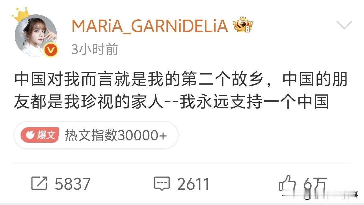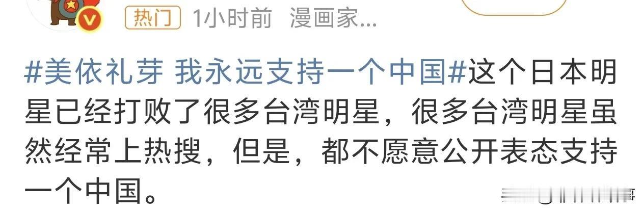 日本歌手美依礼芽,发文永远支持一个中国。 她发文称:中国对我而言就是我的第二个故乡,中国的朋友都是我珍视的家人一一我永远支持一个中国。 网友:IP地址在日本,她也太勇敢了,来中国吃红利的,都要这个标准。 网友:打败了很多台湾明星,他们经常上热搜,但是都不愿意公开表态支持一个中国。