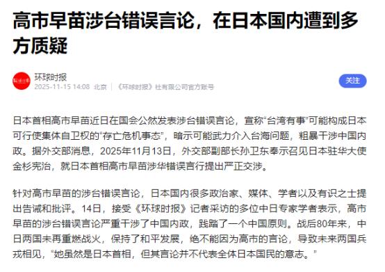 鸠山由纪夫打响了扳倒高市早苗的第二枪,继日本前首相石破茂之后,日本前首相鸠山由纪夫也在社交媒体平台X上抨击了现任首相高市早苗近期关于台湾海峡的粗暴干啥言论。鸠山在帖子中回顾了台湾问题的历史背景,明确敲打高市早苗称日本不应干涉中国内政。 鸠山这次发声的时间点也很巧,刚好跟高市早苗11月7日那番“台湾紧急事态等于日本生存危机”的言论形成强烈对比。高市早苗这话一出口,自己人先炸了锅,鸠山由纪夫更是没给半点情面,转天就在社交平台上开了炮。 高市早苗作为现任首相,说出来的话本应符合日本历届政府的立场。可她偏要扯着“生存危机”的大旗说台湾问题,这就完全越界了。大家都知道世界上只有一个中国,台湾是中国领土不可分割的一部分,这是国际社会公认的事实,更是中日建交时就明确下来的原则。 而鸠山由纪夫在帖子里把话挑得明明白白,他说高市早苗这番言论,根本就是在故意制造紧张氛围,说白了就是想借着所谓的“台湾有事”,为日本扩充军备找借口。这话算是说到了点子上,不少日本民众在网上留言,说终于有人敢站出来说句公道话。 11月8日的发文还没降温,11月11日鸠山由纪夫又补了一枪。他再次强调,日本必须尊重台湾是中国一部分的事实,任何干涉中国内政的行为,都是在给日中关系埋雷。接连两次发声,足见他对高市早苗这种危险言论的警惕。 不光鸠山,之前另一位前首相石破茂早就表过态了。石破茂直接点出,历届日本政府都很谨慎,从来不会把话说得这么绝对,更不会把台湾问题跟日本的“生存危机”绑在一起。他暗指高市早苗的言论,是在打破多年来的外交默契。 除了前首相们,日本其他党派也坐不住了。公明党党首齐藤铁夫直言,高市早苗的话让他非常震惊,这种说法必须赶紧修正,不然老百姓都要慌了。社民党党首福岛瑞穗更直接,她从法律层面反驳,说台湾根本不是一个国家,把台湾问题当成日本动用武力的理由,在法律上完全站不住脚。 当然福岛瑞穗的担忧不是没道理,如果真按高市早苗的逻辑走,日本的武力行使范围就会被随意扩大,这对地区安全来说是天大的隐患。日本民众也清楚,一旦卷入台海纷争,最终吃亏的还是自己,没人愿意为这种错误言论买单。 更让人在意的是高市早苗的争议操作还不止这一件,有政府内部消息透露,她正琢磨着修改《国家安全保障战略》等“安保三文件”,甚至想动“无核三原则”里不引进核武器的规定。这一连串动作连起来看,她的意图就很明显了——借外部话题造势,推动日本军事松绑。 可她忘了,日本战后的和平发展,正是建立在这些原则基础上的。现在为了政治私利,就把这些底线抛在一边,不仅会遭到国内各界的反对,还会让周边国家对日本的动向更加警惕。日中关系本来就需要精心维护,高市早苗的言论无疑是在添乱。 鸠山由纪夫这些人的发声,恰恰代表了日本国内的理性声音。他们清楚,干涉台湾问题没有任何好处,只会让日本陷入更危险的境地。高市早苗要是还执迷不悟,继续发表这种不负责任的言论,别说扳倒她的“枪”会越来越多,她自己也迟早要为这些话付出代价。 台湾问题是中国的内政,这一点谁都改变不了。日本政客与其在台海问题上动歪心思,不如多关注国内民生。毕竟,把精力放在改善老百姓生活上,比制造对立和紧张要实在得多。 来源:环球时报