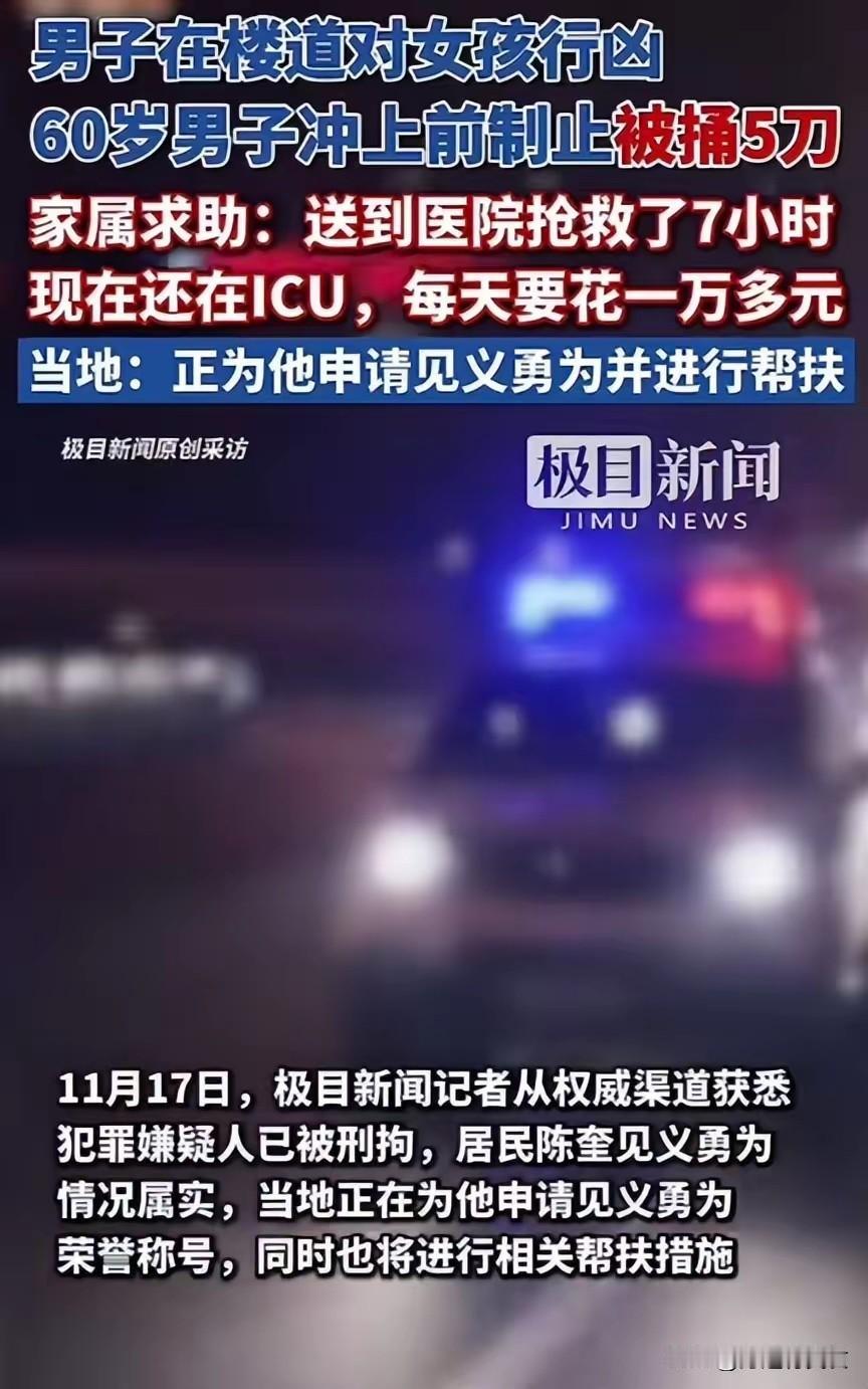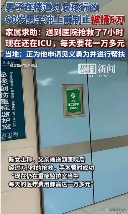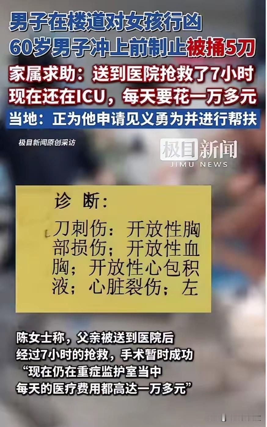 2. 60岁大叔制止持刀行凶被捅5刀昏迷 家属求助:60岁退伍军人陈奎制止持刀行凶救素不相识15、6岁女孩,被捅5刀昏迷ICU,每天治疗费万元,家属求助。警方确认其见义勇为,基金会介入,但家庭无力承担。被救女孩有应激反应,专家指救助机制存启动慢等问题。稿件来自头条Al订阅