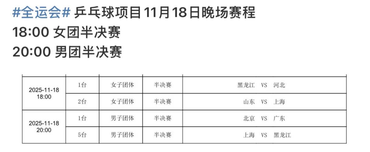 全运会乒乓球项目11月18日晚场赛程 18:00女团半决赛 1号台 女团半决赛 黑龙江VS河北 2号台,女团半决赛 双打女团VS上海女团 20:00,男团半决赛 1号台,北京队VS广东队 5号台,男团半决赛 上海男团VS黑龙江男团 黑龙江男团厉害👍啦, 男女团体都晋级四强啦! 今年不好预测, 夺冠的热门团体辽宁女团 都被干翻啦, 一切都是未知, 谁拿下双打,谁获胜的几率更大, 其实河北女团了不起, 击败辽宁队就是突破! 这赛程安排的, 就不能明天半决赛, 后天决赛吗?