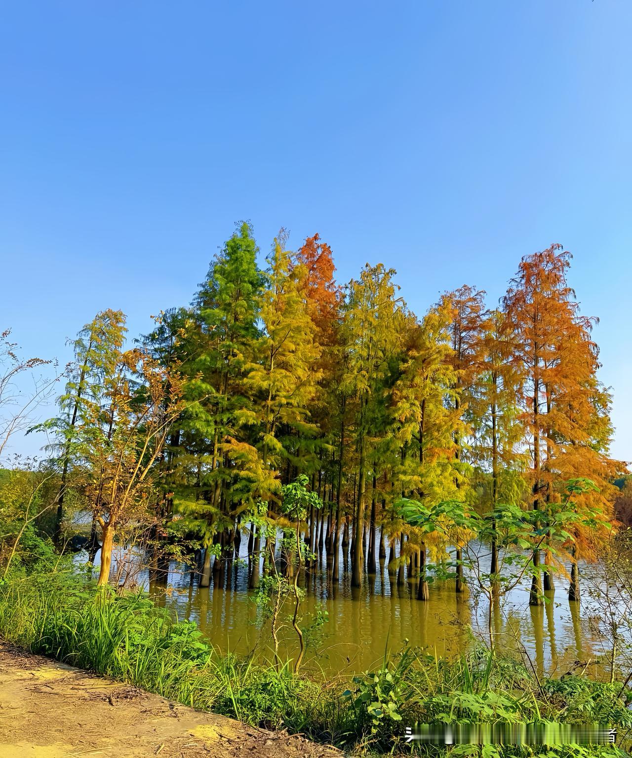 看这潭里的落羽杉,把秋揉成调色盘——绿得清透,黄得软,橙得晃眼。 风掠过枝叶,细羽似的叶梢颤了颤,一片橙红飘进水里,像只小纸船荡开碎金。 秋哪是“萧瑟”?这树一半泡在水,一半撞进天,活得敞亮。连树干浸在水里的纹路,都洇着暖光。 比起寻秋,偶然撞见的鲜活才勾人。连鞋边的泥,都是这场相遇的小糖粒。 秋天的落羽杉