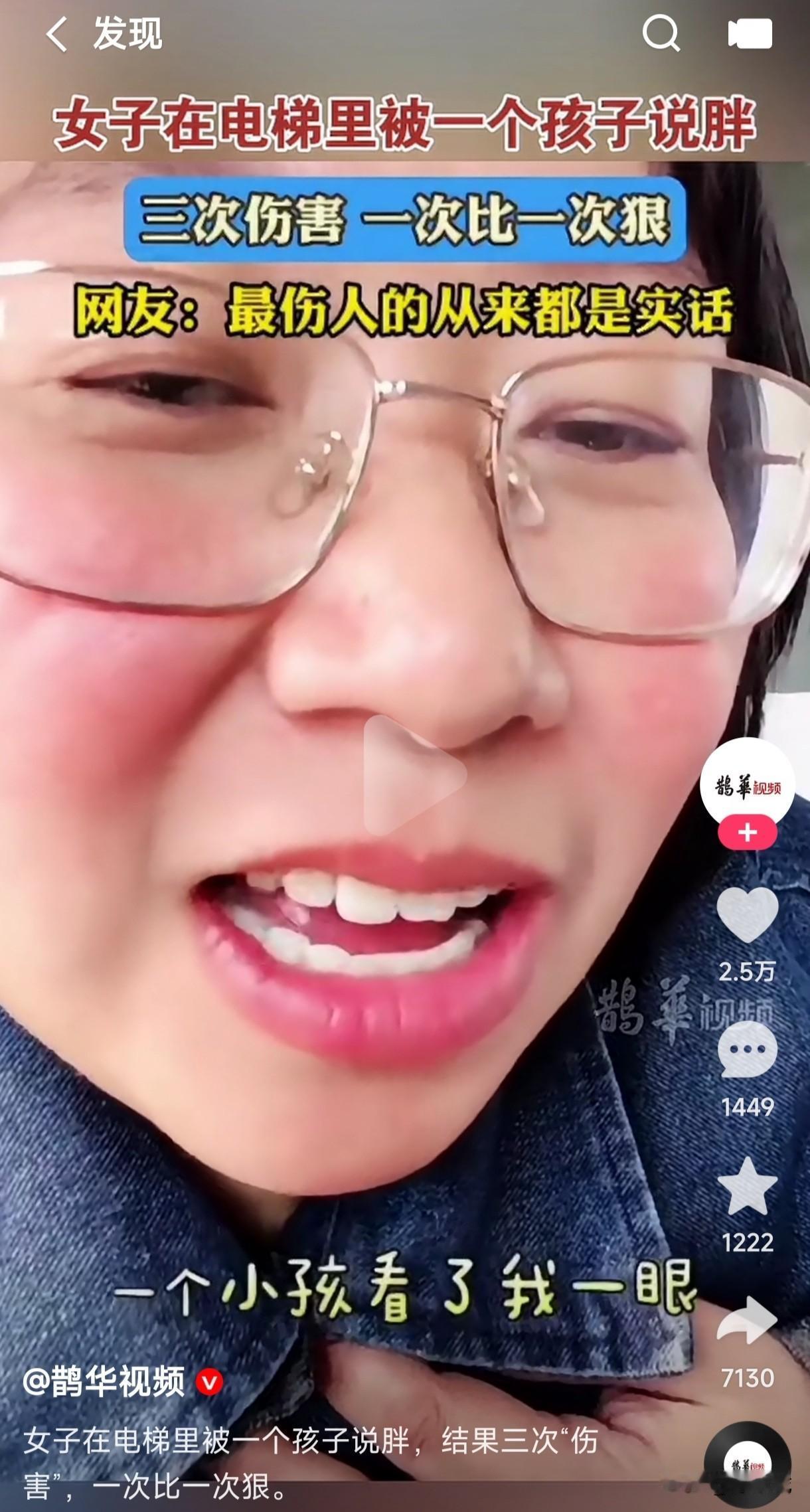 女子自述电梯遇到一孩子被闪电三连鞭说胖,三次伤害一次比一次狠。 她说自己在电梯里遇到母子俩,孩子对妈妈说这个阿姨长的跟熊二一样胖,结果孩子妈妈对孩子说,不能这样说别人,赶紧给阿姨道歉,没想到孩子来一句熊阿姨对不起,等母子俩出了电梯,女子又听到孩子妈妈给孩子说,你看见别人长的像什么不要说出来好不好,这果真是闪电三连鞭的伤害,难道胖人都会让别人这样说吗? 女子又说自己心态好,自己胖这是事实,但从来没有遇到过三次被人说胖的,这是不是对胖人来说太扎心了?