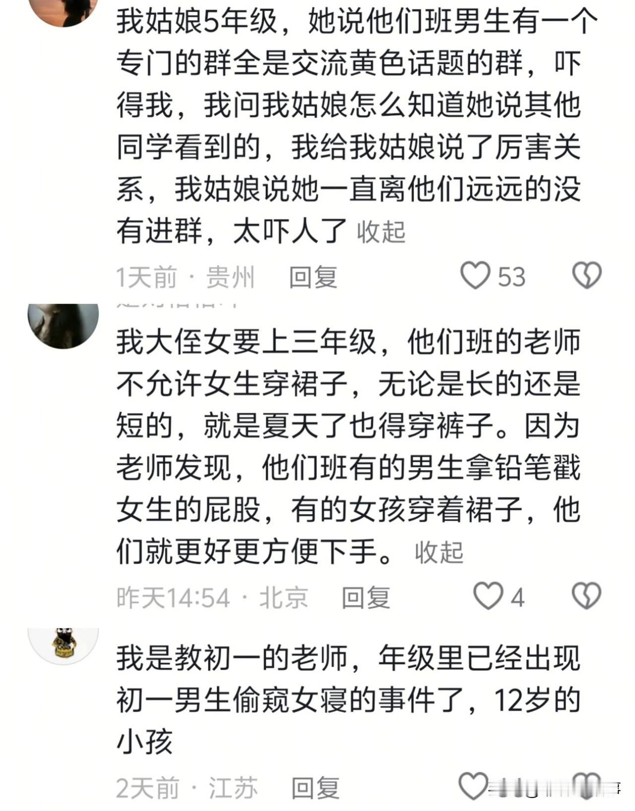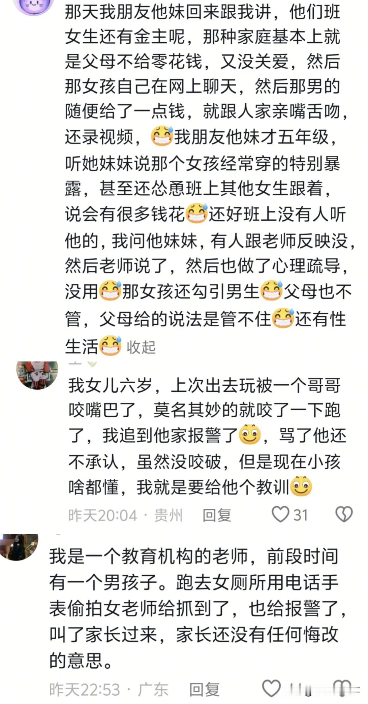 现在孩子太早熟了,好难管,一不小心就会长歪了,一个博主谈到自己小学二年级的侄女,社团里的同学,给班级里的女生,看自己妈妈没穿内裤的私密照片,被女同学告诉了老师,本来以为是个例,一看评论区惊呆了,他们这个年纪我还在玩泥巴。
