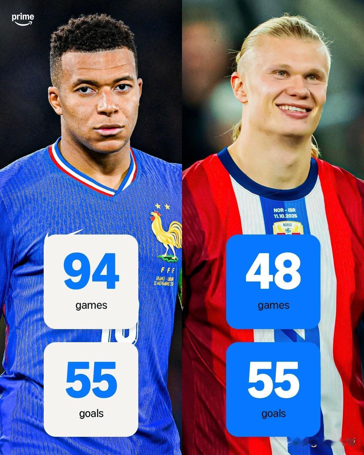 进球效率超姆巴佩一倍,国家队射手王的记录迟早是哈兰德的! 25岁的哈兰德为挪威国家队出战了48场比赛,就已经打进了惊人的55球,而26岁的姆巴佩为法国国家队出战了94场比赛,同样打进了55球,进球效率只有哈兰德的一半。 不得不说哈兰德的进球效率真的是太恐怖了,按这样的效率,未来哈兰德在国家队的进球数至少要超过200个了,别说梅西的国家队进球数,即使C罗的国家队进球数也会被哈兰德轻松打破了。 姆巴佩已经够天才了,但是在哈兰德面前还是稍逊一筹,哈兰德唯一的遗憾就是没有出生在足球强国,要不然现在的荣誉绝对会更多了。