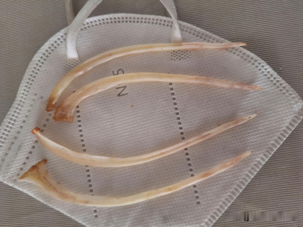 博斯腾湖的鱼这么大,一条有五公斤多,切成七八段冻冰箱里。图7是它的鱼刺,这么大个。一般人不会被卡住,被卡住的不是一般人,大概率没治了,无论身体还是智商。
