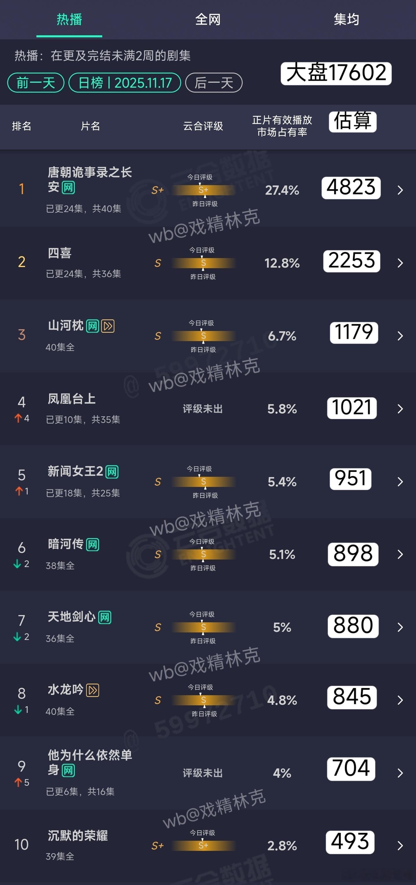 11.17云合估算:🥝给唐诡膨胀,🐧给四喜膨胀。就👖没给凤凰台上膨胀。一部更比一部扑