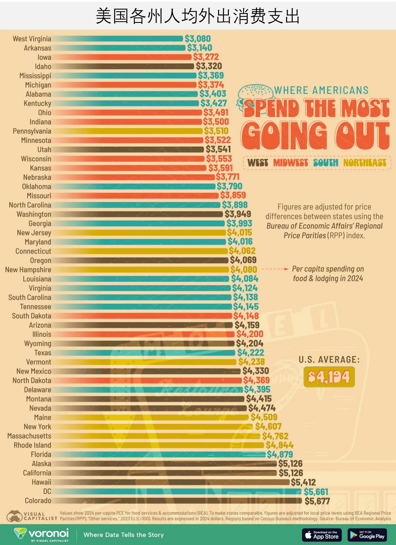 美国哪些州的人在外出消费方面支出最多? 从丹佛的滑雪后聚餐到檀香山的双份浓缩咖啡,美国人外出时总会喜欢犒劳自己一番。 但他们愿意(以及能够)投入的资金数额却差异很大。 下面图表根据 2024 年各州及哥伦比亚特区在食品服务和住宿方面的人均支出情况进行了排名(剔除了地区价格差异因素)。 此图表所使用的数据来自美国经济分析局。 为使各州的数据具有可比性,根据 2023 年的数据,使用美国经济分析局的“其他服务”地区价格平价(RPP)对“其他服务”领域的数据进行了当地价格水平的调整。各地区依据的是美国人口普查局的方法。结果以 2024 年美元计价。 ——美国人外出消费最多的州 在榜单中位居榜首的是科罗拉多州居民,他们每人平均花费 5677 美元,比美国平均水平高出约 1500 美元。 紧随其后的是哥伦比亚特区,其人平均花费 5661 美元。那里聚集了大量的面向高薪专业人士的餐厅。 夏威夷(5412 美元)、阿拉斯加(5126 美元)和加利福尼亚(5126 美元)位列支出最多的五个地区之列。 这既反映了以旅游业为驱动的经济模式,也体现了家庭收入的增加,清晰地展现了繁荣与生活方式之间的相互影响。较高的工资为人们提供了可自由支配的余地,而繁荣的休闲产业则提供了众多消费途径。 ——中西部地区更喜欢在家用餐 区域差异很快便显现出来。西部各州表现最为突出,人均花费为 4446 美元,这得益于其众多的旅游胜地和时尚的城市中心。 东北地区以 4292 美元位居第二,这得益于像纽约和波士顿这样密集的城市布局。 与此同时,中西部各州的人均花费仅为 3721 美元,比美国的平均水平低了整整 700 美元。 在最下面依次是西弗吉尼亚州(3080 美元)、阿肯色州(3140 美元)、爱荷华州(3272 美元)、爱达荷州(3320 美元)和密西西比州(3369 美元)。