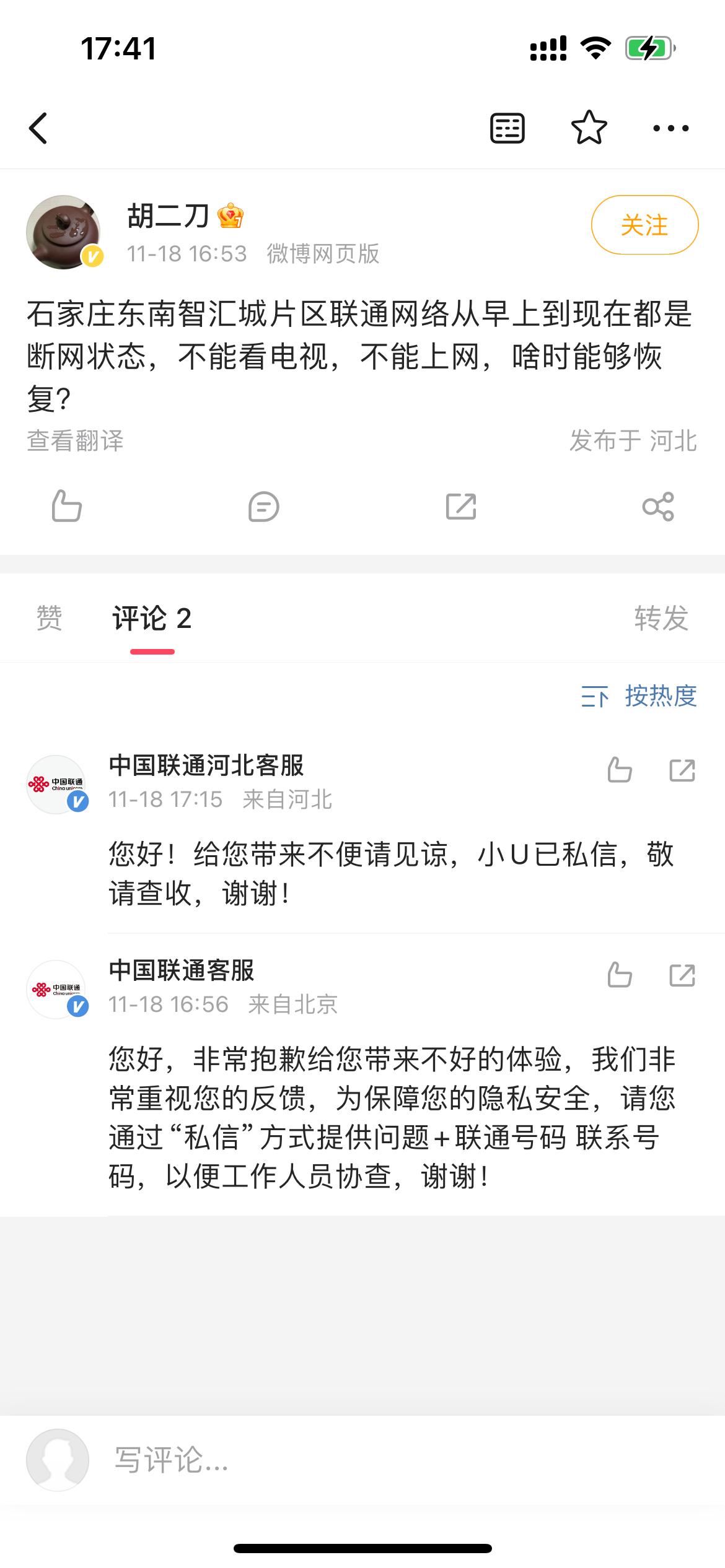 联通投诉新路径,联通客服秒回石家庄客户微博诉求!速度属实惊人! 刚才刷微博无意中看到有位网友抱怨石家庄东南智慧城片区联通网络从早上到下午一直是断网状态,不能看电视,不能上网,想知道啥时候能恢复网络。 微博发布仅仅三分钟后,中国联通客服便第一时间在微博下留言,希望这名网友能够通过私信留下详细信息帮助网友解决问题。 十几分钟后,中国联通河北客服再次再微博下留言,告知网友已私信联系,敬请查收! 微博客户端几千万客户每天上亿条微博信息,联通客服竟然能第一时间精准定位网友诉求,实在让人意外! 看来作为曾经的通讯三巨头之一,联通的服务意识也在加强啊!中国联通 中国联通 线上投诉