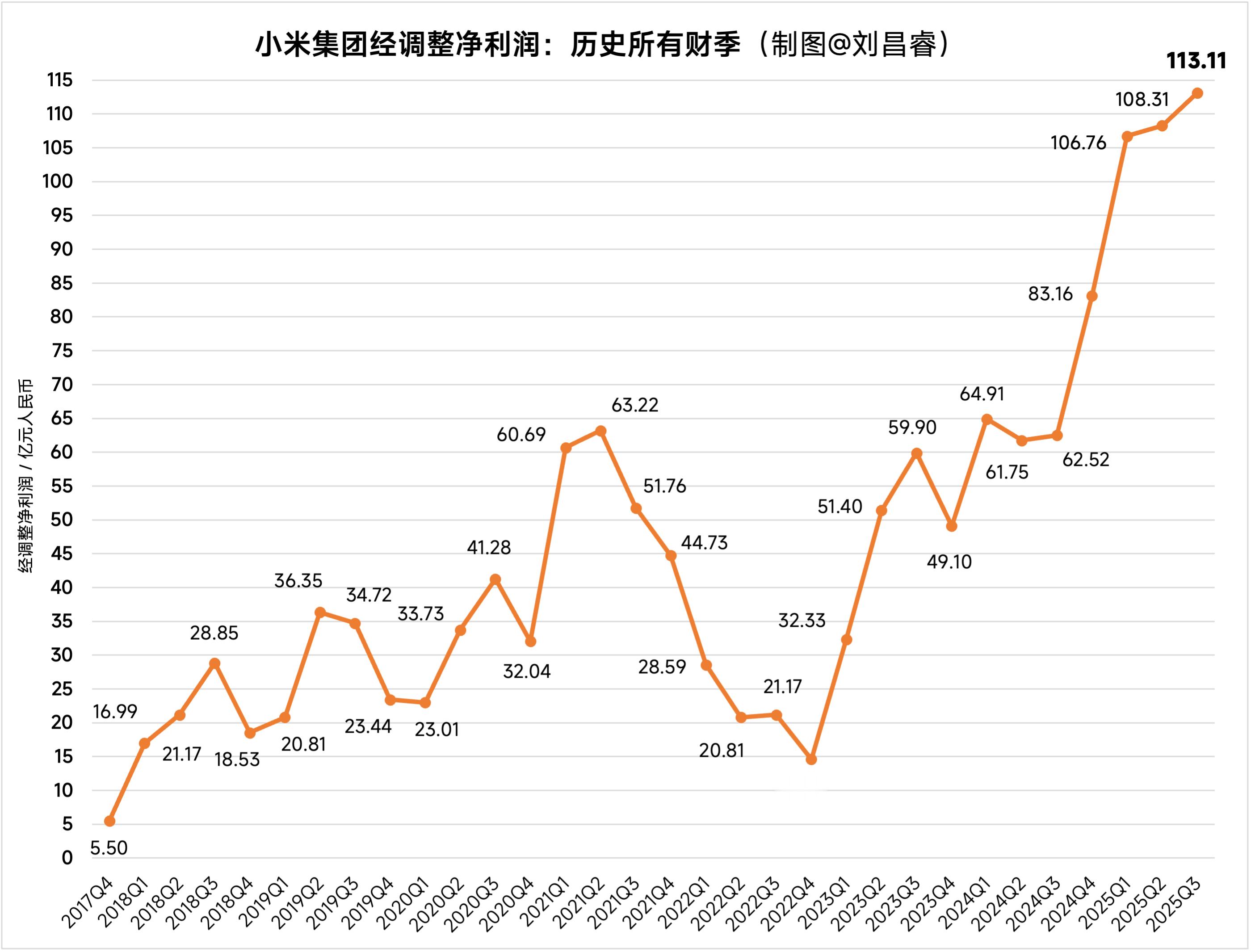 小米集团2025Q3财报:强韧增长,稳步向前。总收入1131亿元,连续4个季度超千亿,同比增长22.3%;经调整净利润113亿元,同比增长80.9%。智能电动汽车及AI等创新业务收入290亿元,首次实现单季盈利。“人车家全生态”深度融合,三大主业均保持稳健增长。智能手机全球出货量4330万台,连续9个季度同比增长;IoT业务收入276亿元,连续7个季度同比增长;互联网业务收入94亿元,创下历史新高。智能电动汽车及AI等创新业务加速成长,当季新车交付108796台,小米YU7位居10月国内SUV车型销量第一。