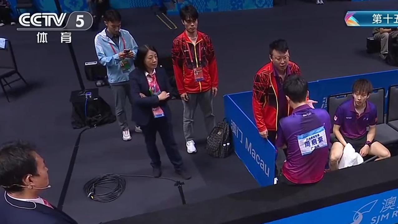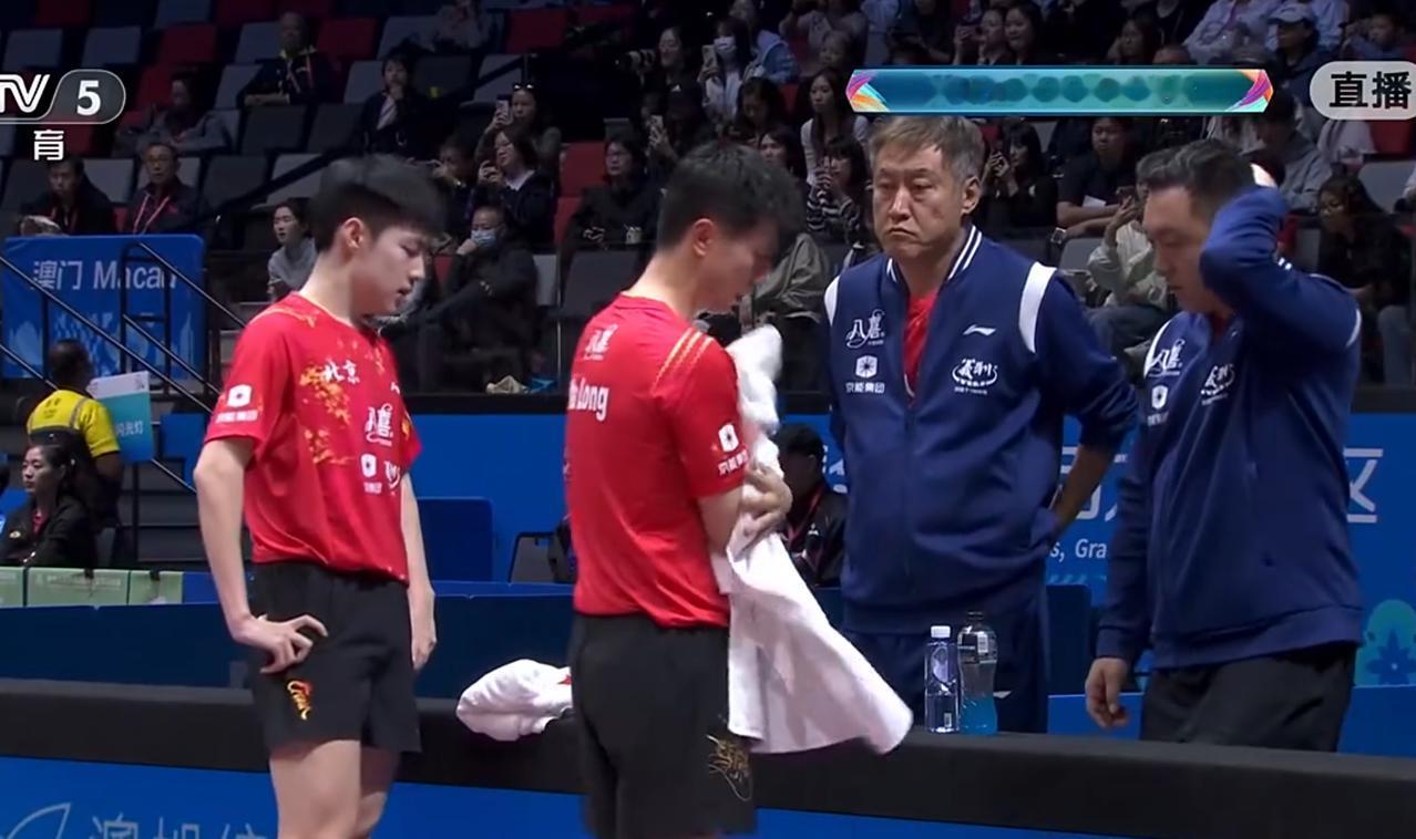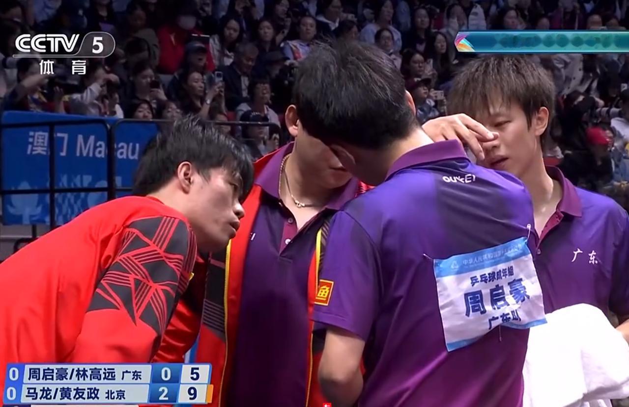 突发,周启豪受伤,叫了医疗暂停! 又是这个教练, 很严厉, 一直盯着周启豪教练。 不过马龙黄友政也去教练那里了。 这就很公平了。 前两局广东队0:2输了, 第三局北京队9:5领先, 所以这个暂停问题不大了, 最后北京队11:6拿下第三局 北京队3:0胜了广东队。