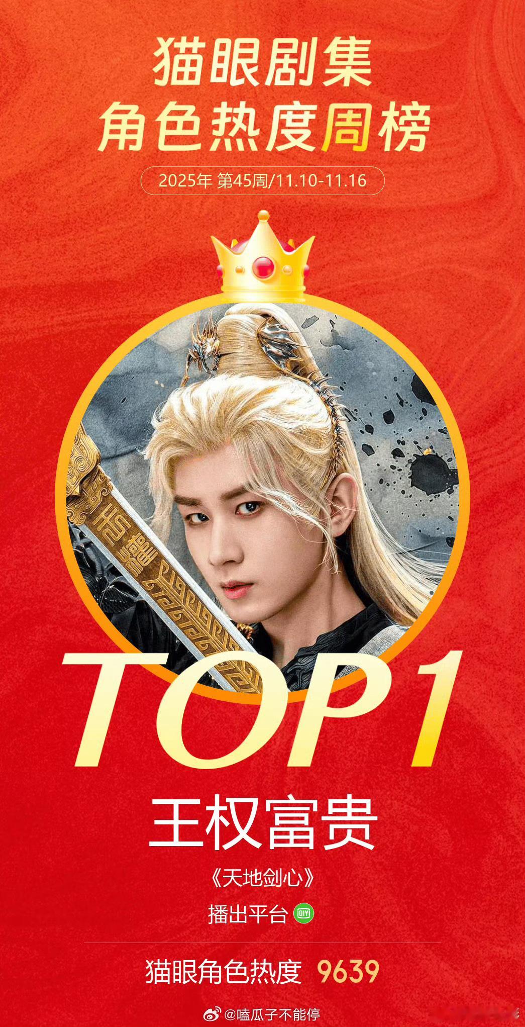 成毅王权富贵连续四周登顶全网角色热度第一!