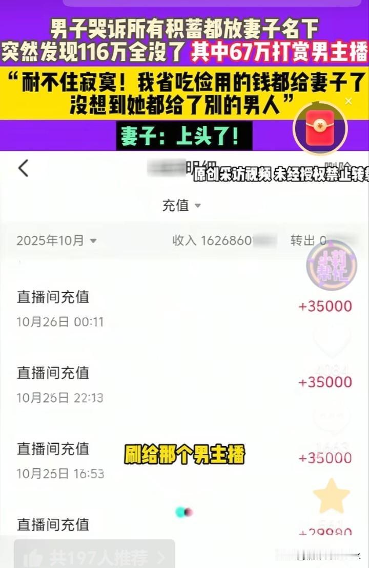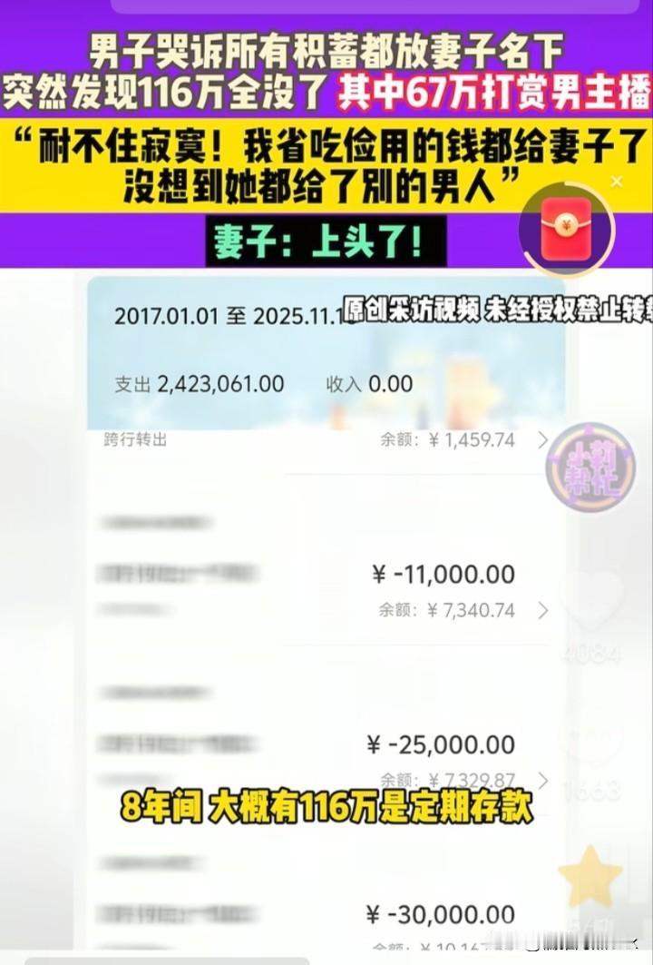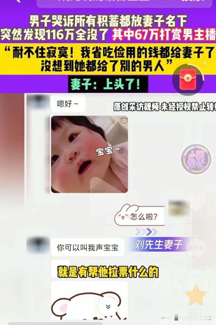上头了!郑州男子哭诉所有积蓄都放在妻子名下,116万元败光还倒欠8万多的债,其中67万元打赏男主播,男子气得捶胸顿足,要离婚。女子就一句“上头了”。 郑州的刘先生向记者反映,近日,他想看看存在妻子名下账户的存额,妻子遮遮掩掩的不给看,好不容易看到了,肺都要气炸,只剩三毛钱。 刘先生称,他常年在郑州打工,妻子在家专职照顾孩子,为了让妻子有安全感,每个月的工资都按时转给妻子,所有的钱都存在妻子名下的账户,8年了,定期存款有116万元,一下子清零了,还倒欠8万多元。 在刘先生的逼问下,妻子承认有67万元打赏了男主播,其余的钱说不出所以然。 刘先生怀疑,剩余的钱肯定妻子与男人线下交易支付了,但妻子又不承认与人线下见面。 刘先生气得捶胸顿足,对记者说,“不爱了,我对她已经死心了,我真心对她,没想到她在家背刺我”。 记者也不相信,那些钱你都刷给男主播了?怎么花的? 刘先生妻子说,60多万刷给男主播了,聊天,PK拉票等,上头了! 刘先生哭诉道,你在家住着好房子,有地暖,我在郑州租300元一个月的房,冬天漏风,夏天漏雨,你耐不住寂寞,赚的钱你都给了别的男人,太寒心了。 从手机账号上可以看到,从2017年到2025年,8年间,刘先生向妻子转出243万元,平均一年收入30万,总共存了116万,每年存14.5万,刘先生真的很努力,也很相信和爱妻子,妻子也没亏待自己。 从妻子的手机转账记录可以看到,妻子有一颗不安份的心,几乎每天向男主播转账,都是3.5万元一笔,出手真阔绰,早已将那个在外为她打拼的丈夫忘得九霄云外。 打赏这么多回报是什么呢?廉价的情绪价值,一句“宝宝”,“乖乖”,就晕头转向上头了。 刘先生认为妻子的大额打赏是夫妻共同财产,已经将此事反映给直播平台,已经上传资料等确认。将钱追回后,准备与妻子离婚。 近日,中卫市警方悬挂反诈横幅,精准又扎心。“大额钱财被骗人员98%是女士,当家,管钱,自认会挣钱”。 很多女人认为掌握家庭经济大权就是掌握安全感,但人的认知真是有差别,有的女人不适合管钱,夫妻之间还是要了解,不能将全部身家赌在一个人身上,否则输不起。 有一颗不安份的心的女人不会守家,不懂男人辛苦的女人败家,不赚钱的女人往往不知道赚钱不容易。安全感需两人共同营造,有商有量,真心相待。
