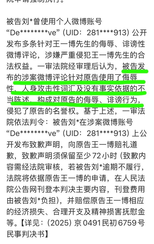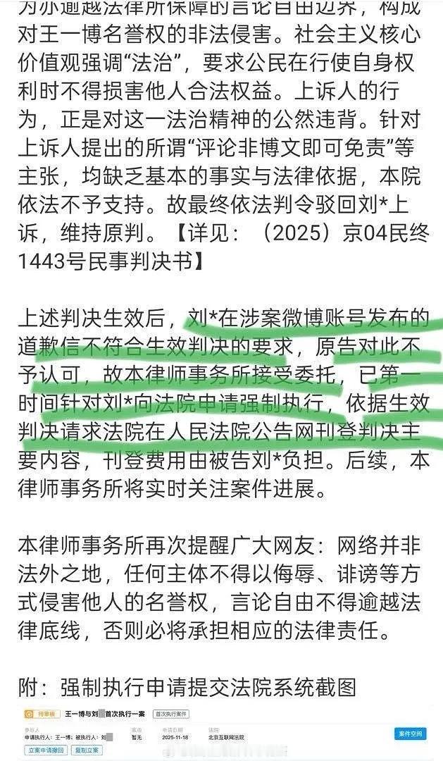 王一博的hei子因为道歉敷衍被申请强制执行啦,爽文来的,此人造谣性质非常恶劣,一审不服还上诉,二审维持原判。道歉想蒙混过关今天被打脸,申请法院强制执行,重新道歉