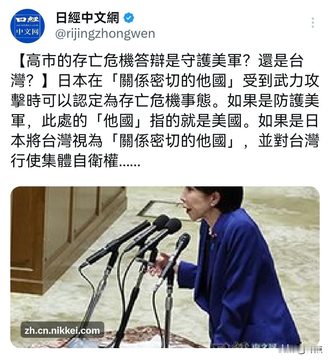 日经中文网发了一篇文章,写到:“【高市的存亡危机事态认定是守护美军?还是台湾?】 日本在‘关系密切的他国’受到武力攻击时,可以认定为存亡危机事态。如果是防卫美军,此处的“他国”指的就是美国……” 这是什么意思?开始为“服软”找台阶了?