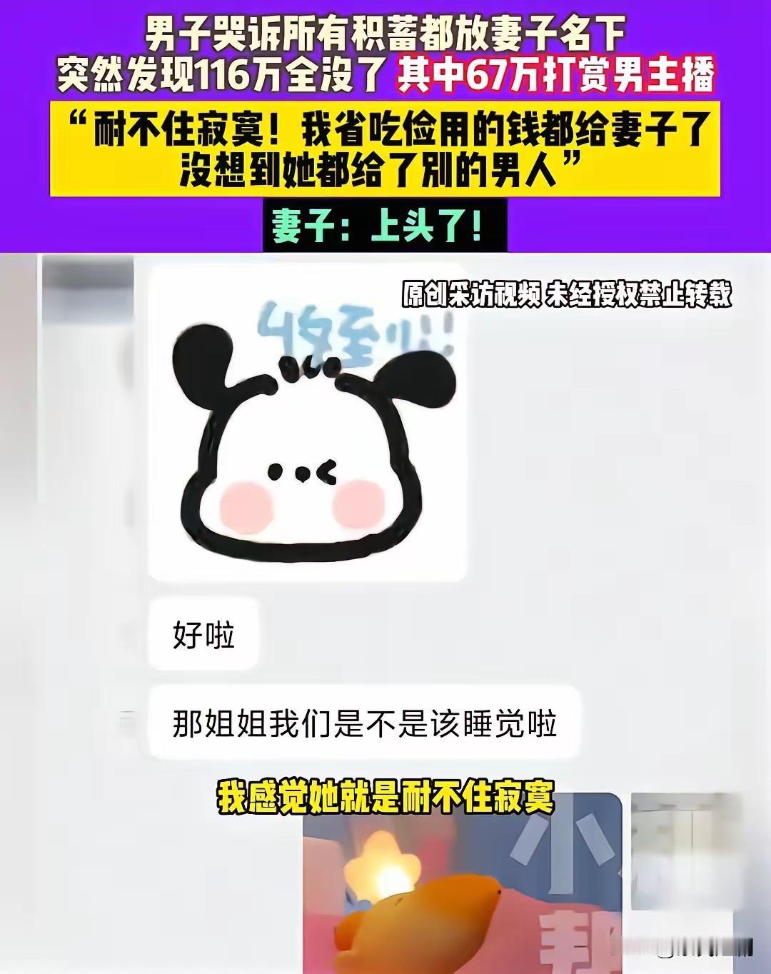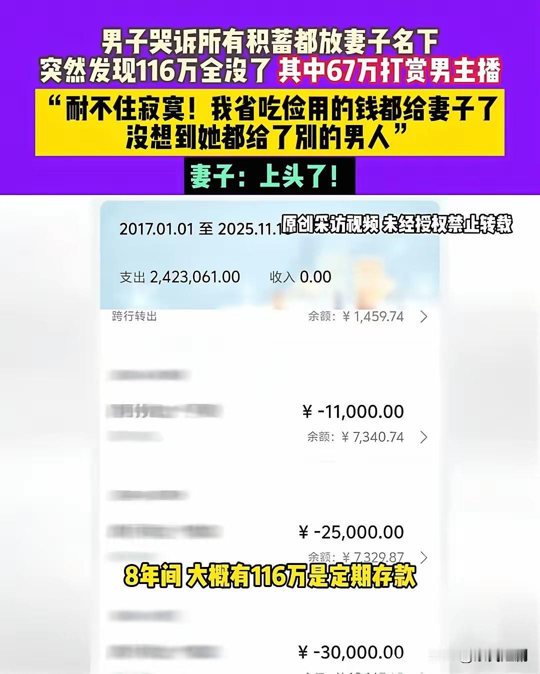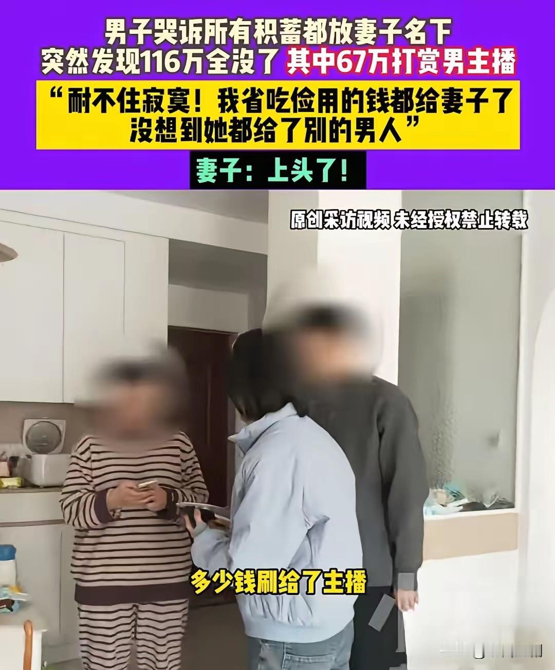 近年来,网络直播成为不少人休闲娱乐的重要途径,然而也衍生出诸多令人叹息的故事。近日,一起家庭财务纠纷引发广泛关注:一名男子辛苦打工多年,好不容易积攒下百万元积蓄,全都交给妻子打理,可短短时间内,这笔钱竟被骗得精光,其中六十七万元被妻子转赠给了一位男主播。 男子为了家庭生活不辞辛劳地工作,多年来省吃俭用,才攒下116万元存款。他本憧憬着这笔钱能让家庭未来更美好,未曾想,妻子在网络直播平台上沉迷打赏,还把大部分存款送给了一位帅气的男主播。妻子坦言:“主播很帅,他叫我宝贝,我一个人在家孤独寂寞,一时就有些上头了。”这番话让人痛心不已,也让男子既愤怒又失望。 男子称,自己在外拼命工作,几乎没时间陪伴妻子,出于信任让她掌管家庭财务,没想到她竟辜负了这份信任,将全部积蓄挥霍殆尽。“我在外面节衣缩食,没想到她把钱都给了别的男人!”他的声音中满是愤怒和无奈。这起事件不仅让家庭财产遭受重大损失,也严重损害了夫妻间的感情。 此事件引发网友热烈讨论。有网友觉得,夫妻之间应相互信任,财务管理需共同商量,以免单方面的财务决策引发难以预料的后果。也有人指出,网络世界诱惑重重,一些主播凭借虚拟魅力吸引粉丝,容易让人沉溺其中,甚至陷入经济危机。 这起事件警示我们,家庭财务应由夫妻双方共同管理,避免盲目信任或放任财务失管。同时,也提醒年轻人要理性看待网络娱乐,防止沉迷虚拟世界而忘却现实责任。家庭的幸福基于相互理解和信任,唯有彼此坦诚、携手奋进,才能共同应对生活中的风风雨雨。 在这个信息泛滥、诱惑丛生的时代,理性与信任格外重要。期望每个家庭都能在金钱与感情间寻得平衡,共同营造温馨、稳定的生活环境。
