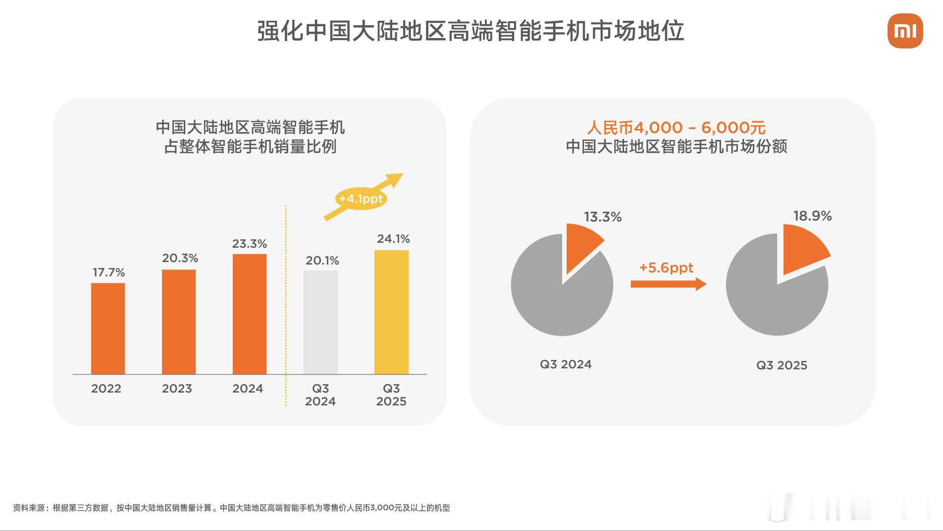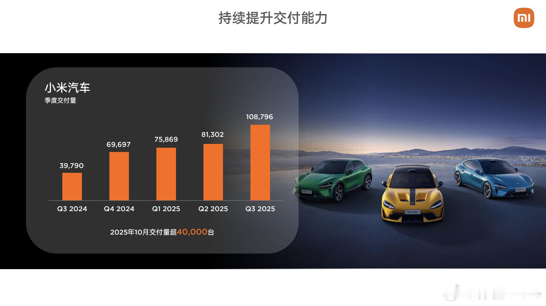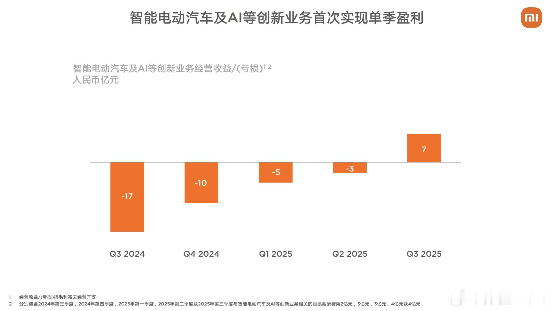 小米今天发了三季度财报,营收1131亿元,经调整净利润人民币113亿元,利润连续3个季度破百亿,并创历史新高。两个点印象深刻:一是小米17系列的高端化,Pro系列大增长。二是小米汽车业务首次盈利。小米三季度交付了108796辆车,同比增加173.4%,小米YU7更是获得了中国市场10月份SUV销量第一。三季度智能电动汽车及AI等创新业务收入290亿元,并首次实现单季度盈利,经营收益7亿元。业务彻底步入良性正轨。这就是典型的用实力回应质疑,连续一年同比高速增长。当然大家都知道这只是一个起点,小米汽车也才两款车型,随着更多的车型铺开,以及进军全球市场,还有大家电的全球化,小米人车家三大业务一起爆发,营收只会越来越多。