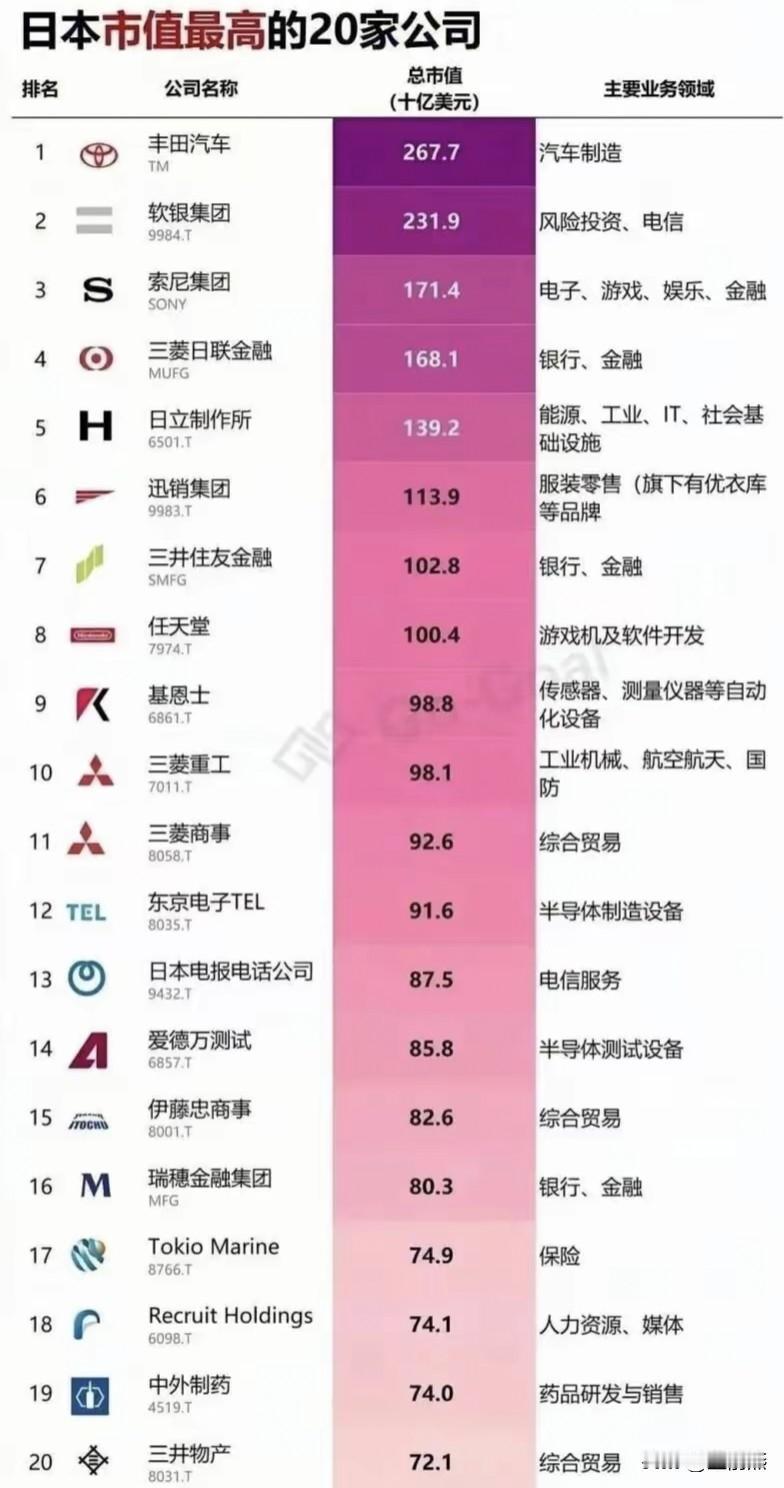 冤有头债有主,看完下图,让你知道该抵制谁了吧——日本市值最大的20家公司排名 日本最大的三家财团是丰田车、软银投资和索尼,快点抵制吧,从你开始——