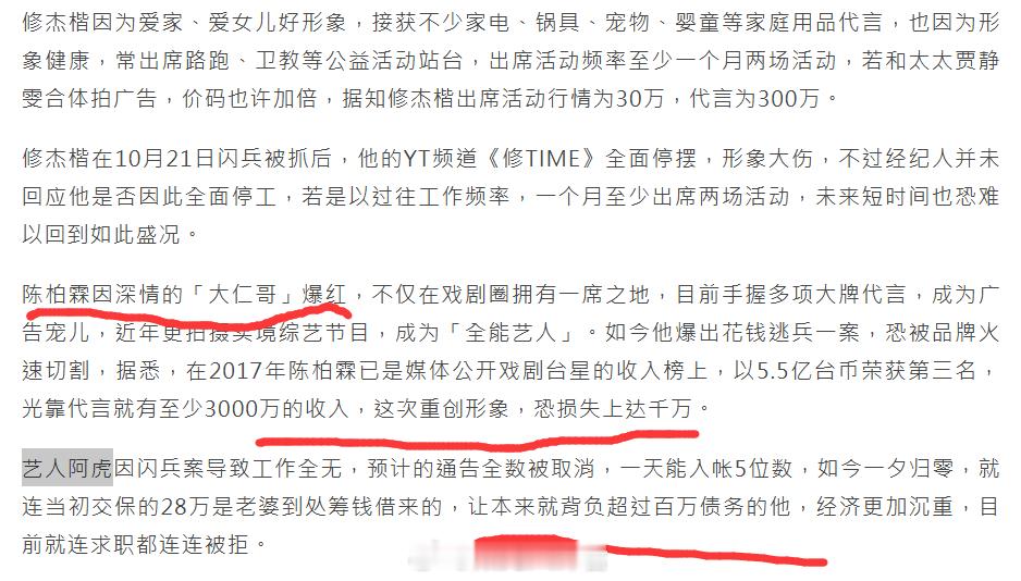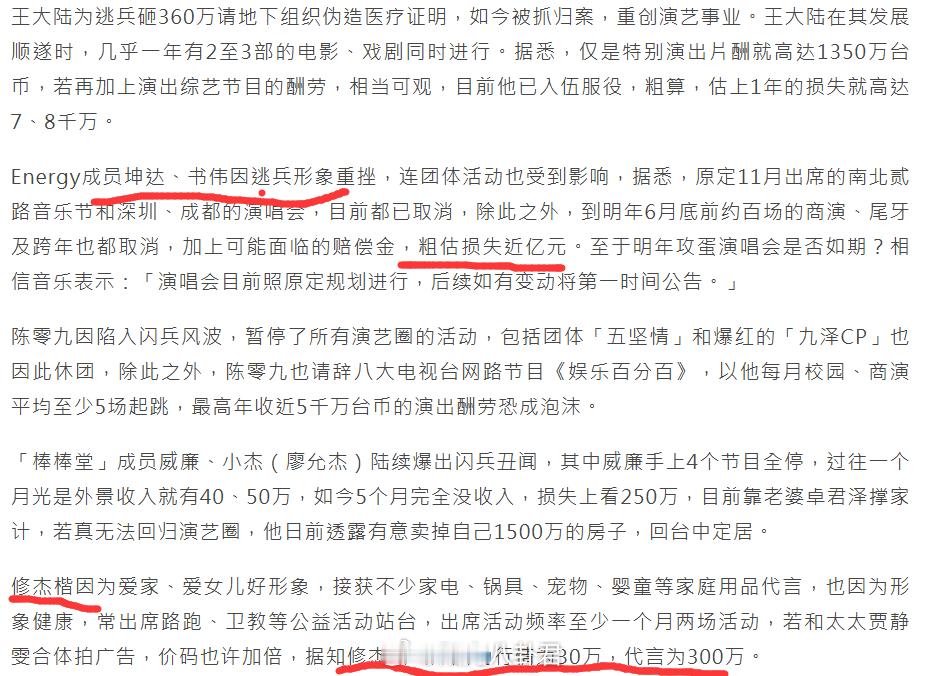 台媒透露18位明星因逃避兵役损失惨重!! Energy恐损失近亿元,陈柏霖损失千万,艺人阿虎背百万债求打工遭拒!王大陆被检警查出涉嫌伪造文书逃避兵役后,许多逃避兵役的艺人纷纷被挖出,包括棒棒堂成员威廉与小杰、修杰楷、陈柏霖、Energy成员坤达与书伟、陈零九、超克7成员李铨、大根、阿虎、陈大天、模特儿陈信维、小熊、舞台剧演员黄博石,再加上日前自首的唐振刚、薛仕凌、阿达,总计已有18名艺人涉及闪兵。
