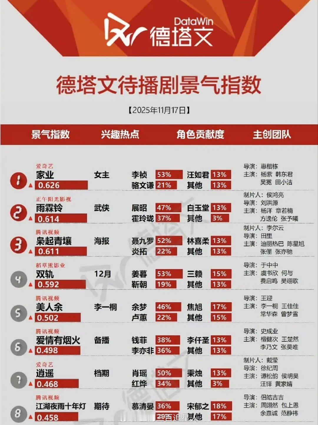 杨紫家业登顶待播剧景气指数,李祯一人扛起了53%,都天下第一墨了拿个第一也很正常