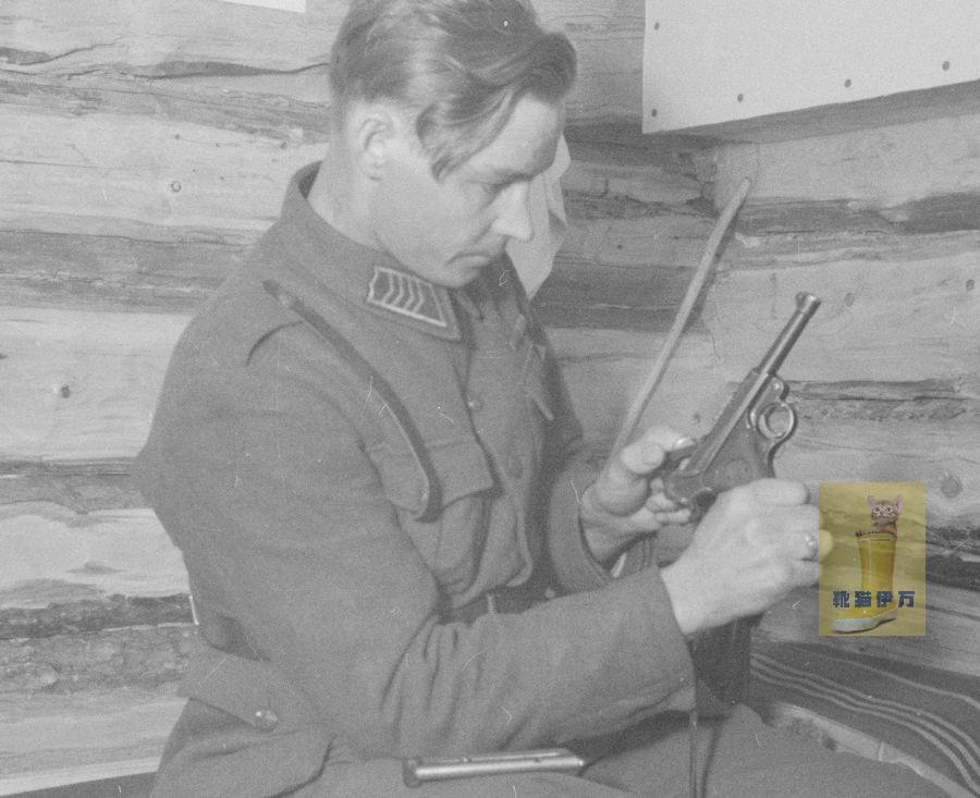 苏芬战争时期,芬兰军队的高级军士凯约宁正在检查他的帕拉贝鲁姆手枪,弹匣放在膝盖上。根据枪管长度判断,这支手枪应为7.65毫米口径的M23型。 大家注意:他手中手枪的握把贴片上有单位番号盘的凹槽——二战前,芬兰军队普遍在枪械上嵌入标示部队番号的铜制圆盘,不过战争期间这些徽章圆盘几乎全被拆除(估计是为了保密,参见图2)。