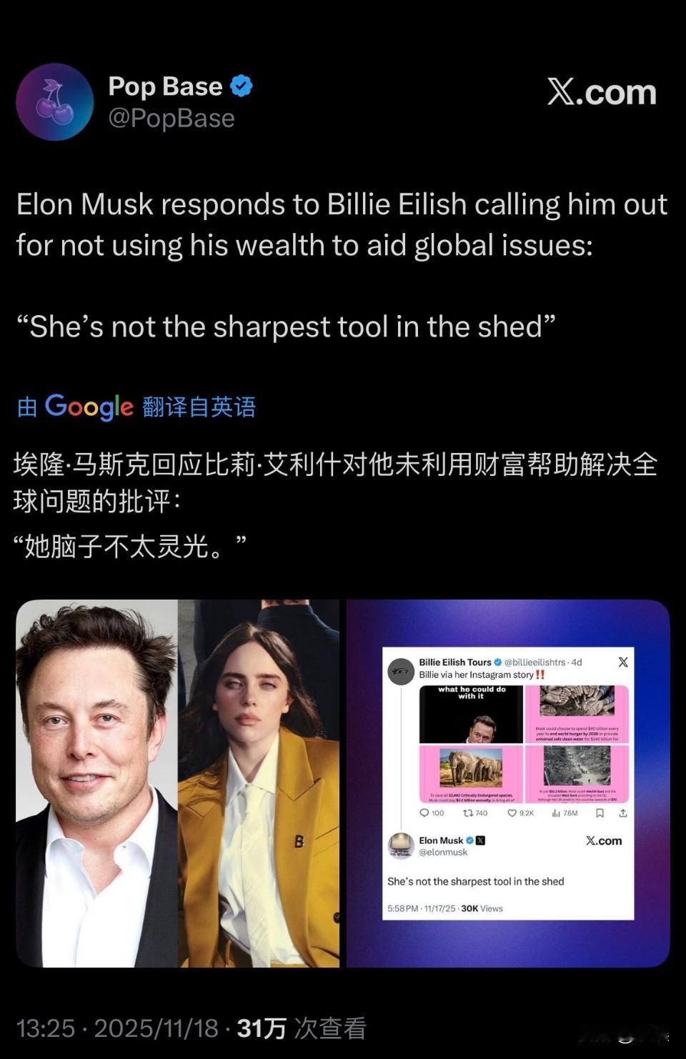 马斯克回怼碧梨:她脑子不咋灵光 我喜欢她这么多年了,还去看了她的演唱会,排队排一天在第一排看的,但是我还是想说,人家捐不捐钱关你什么事啊?!为什么要对别人的钱占有欲那么强!?[吃瓜群众] 马斯克也有捐过特斯拉股份,麻烦她去查一下。[吃瓜群众]马斯克 特斯拉马斯克